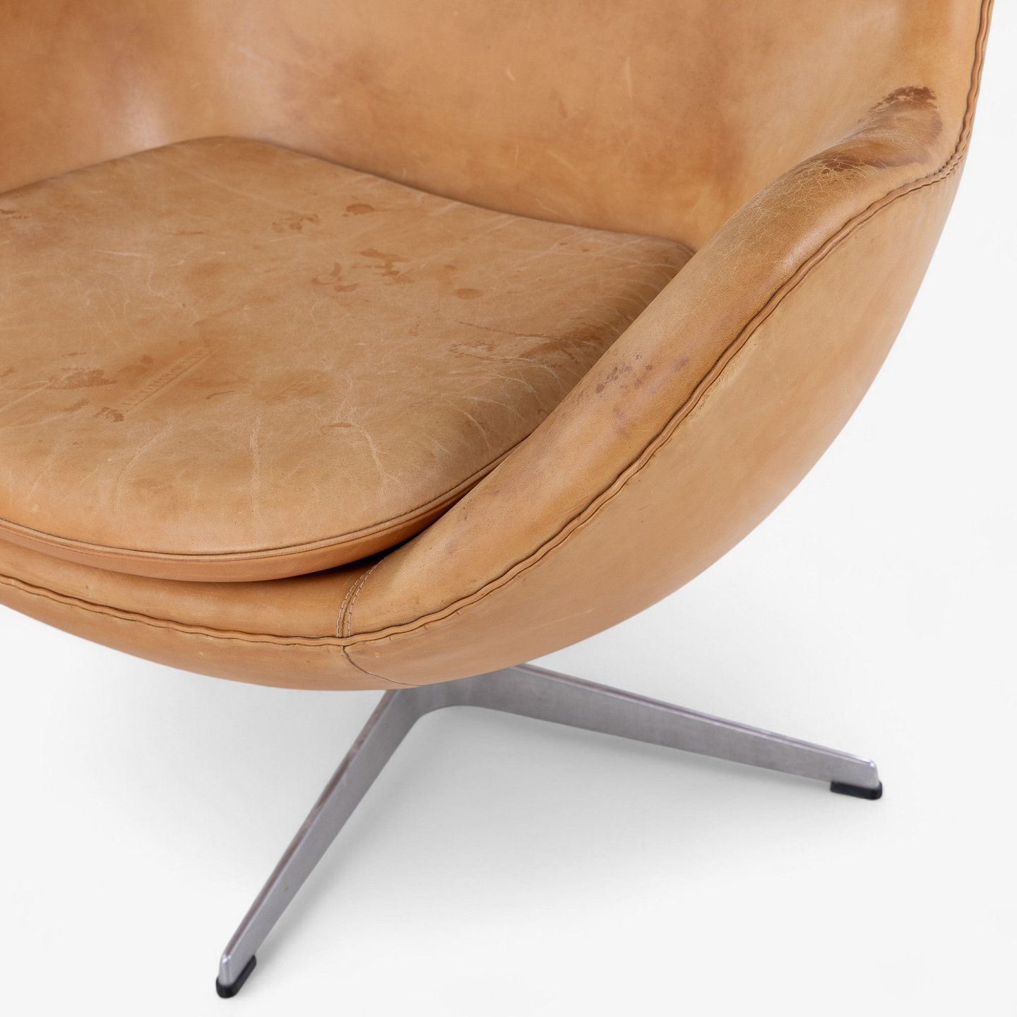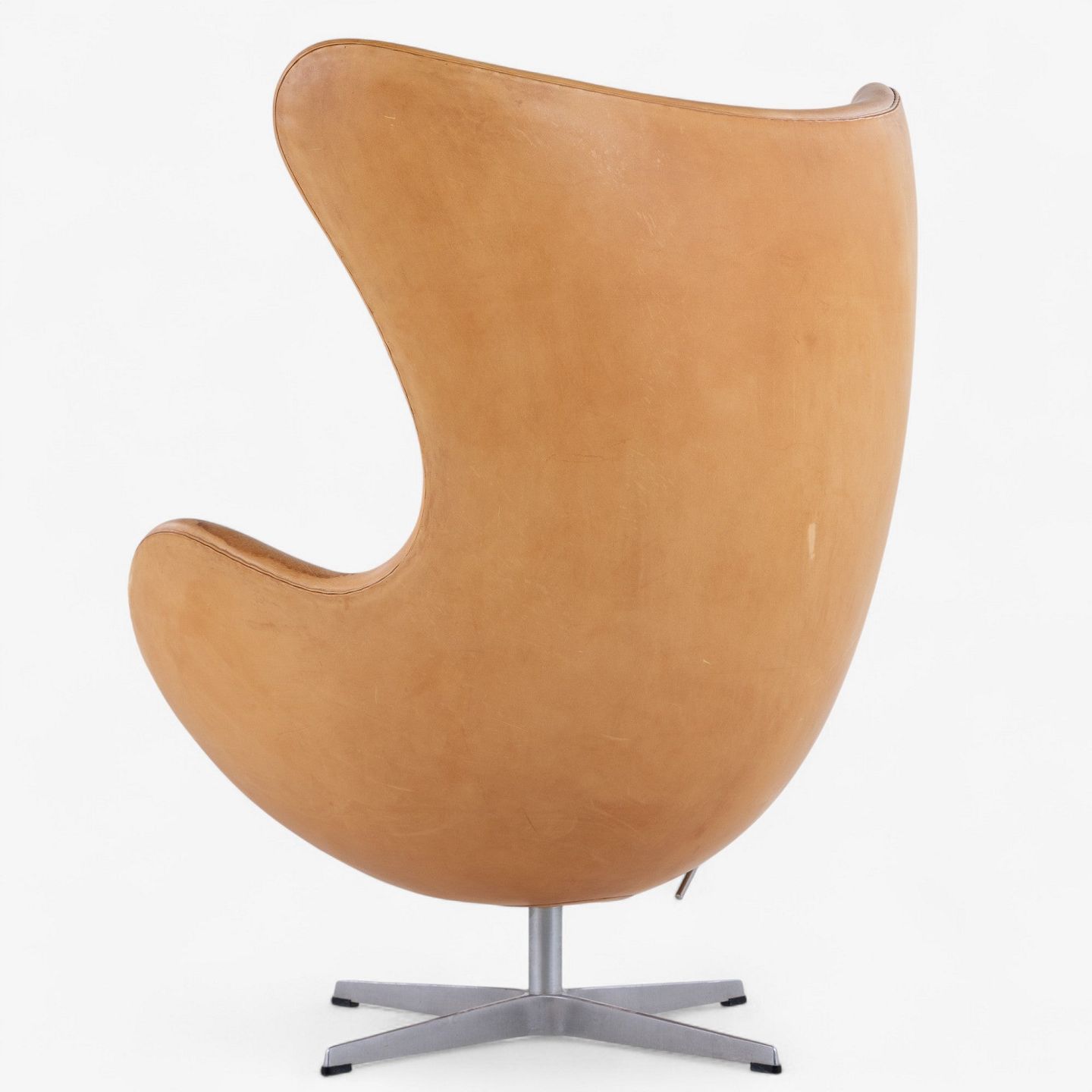 AJ 3316 - 'Ægget'-lænestol i patineret naturskind på aluminiumsfod. Ægget (1958) blev tegnet til SAS Royal Hotel i København sammen med Svanen og Gryden. Stolen er i dag et designikon.