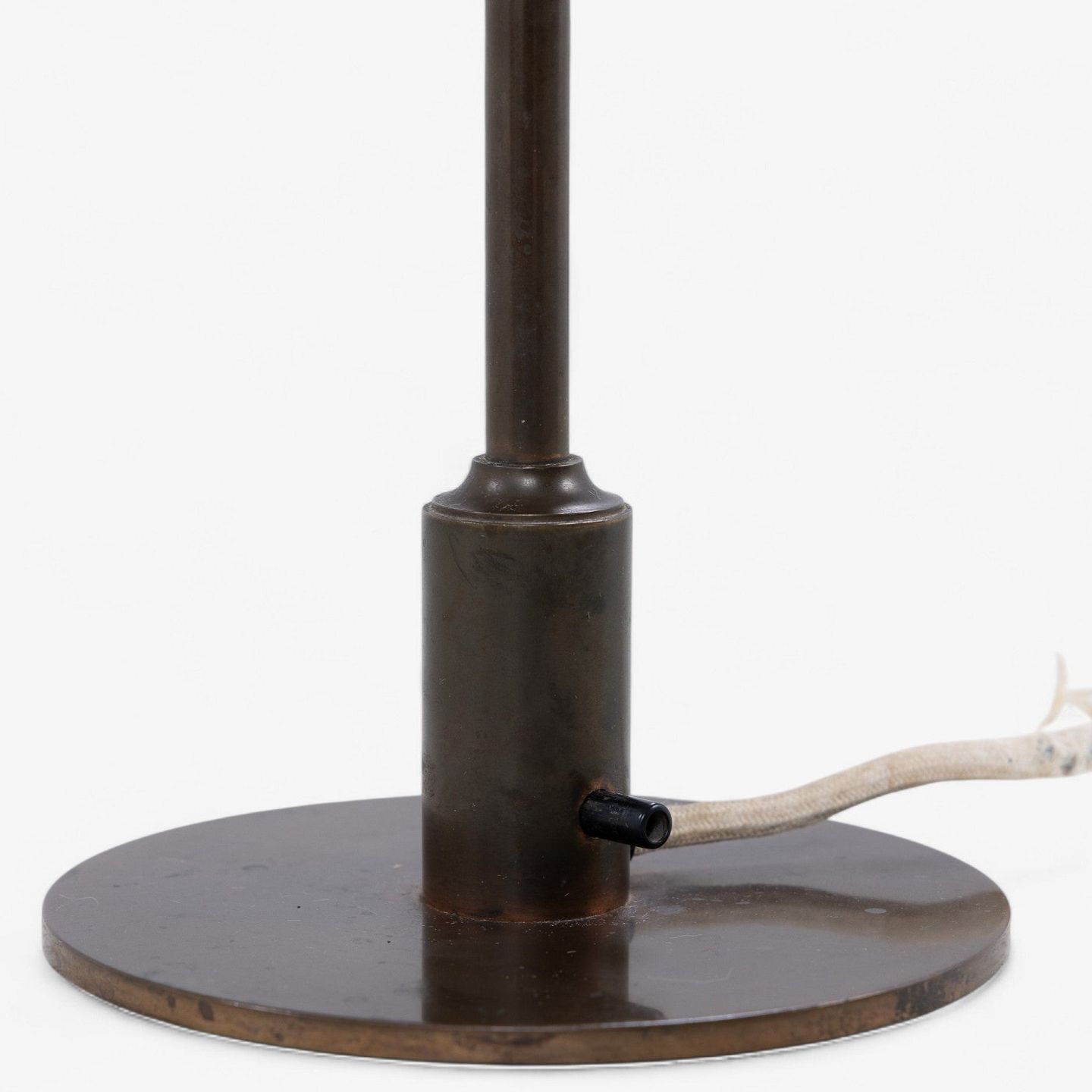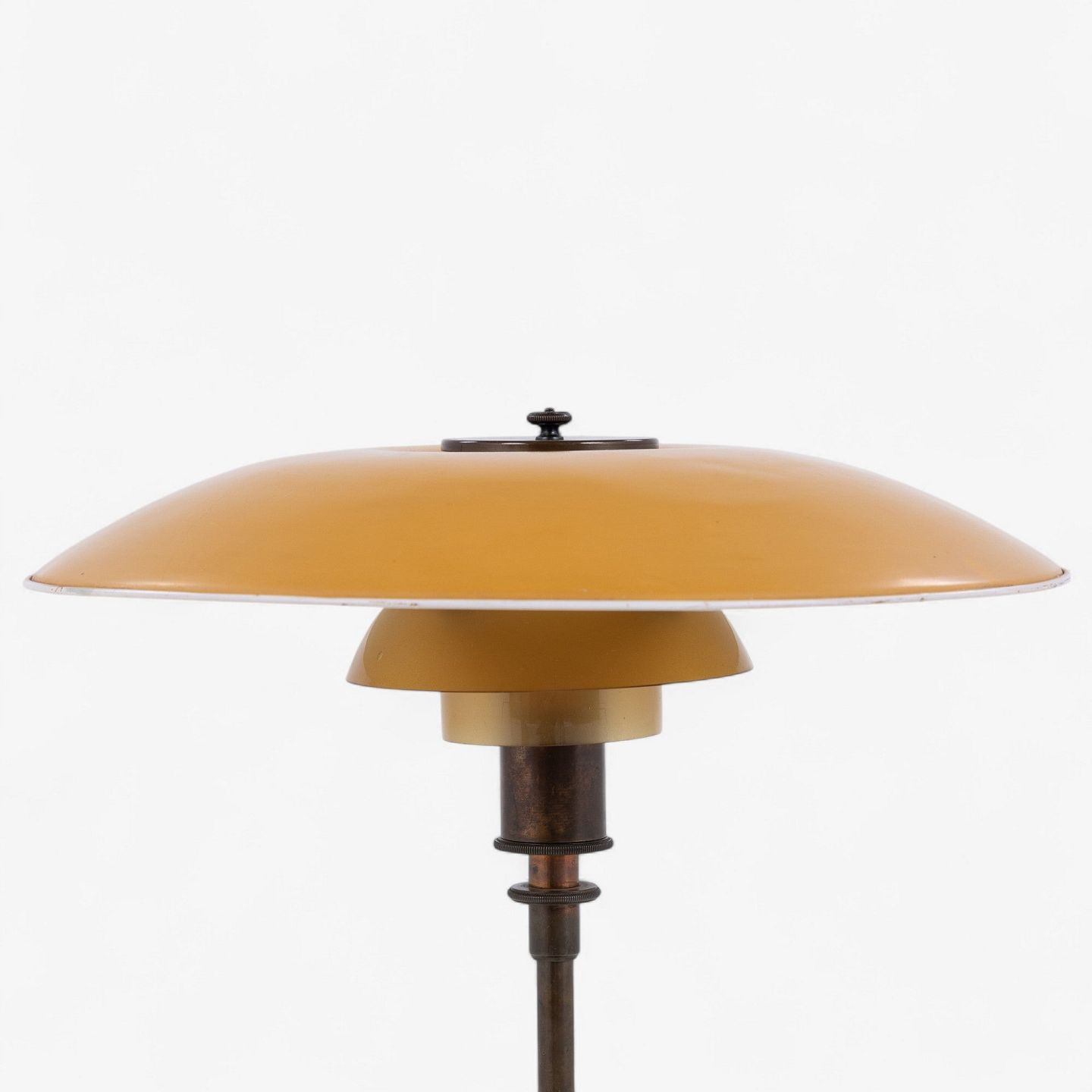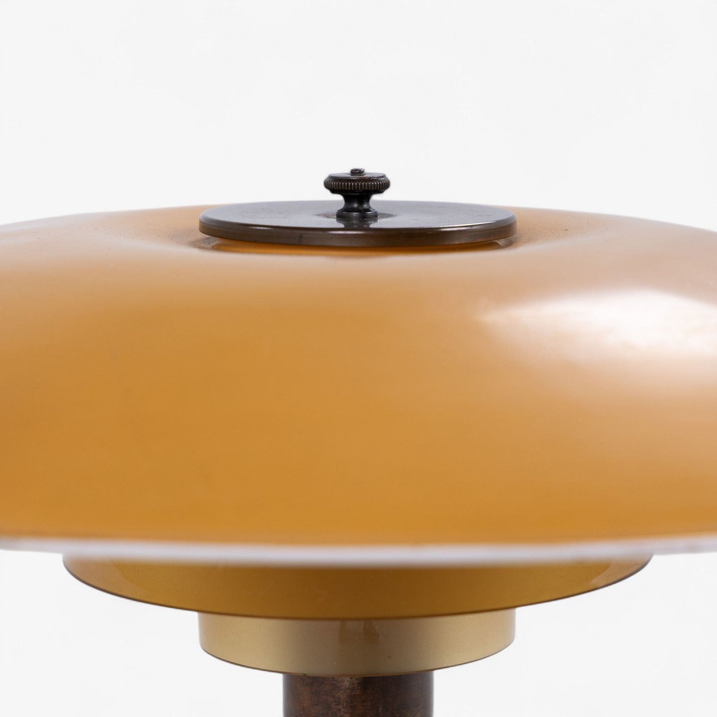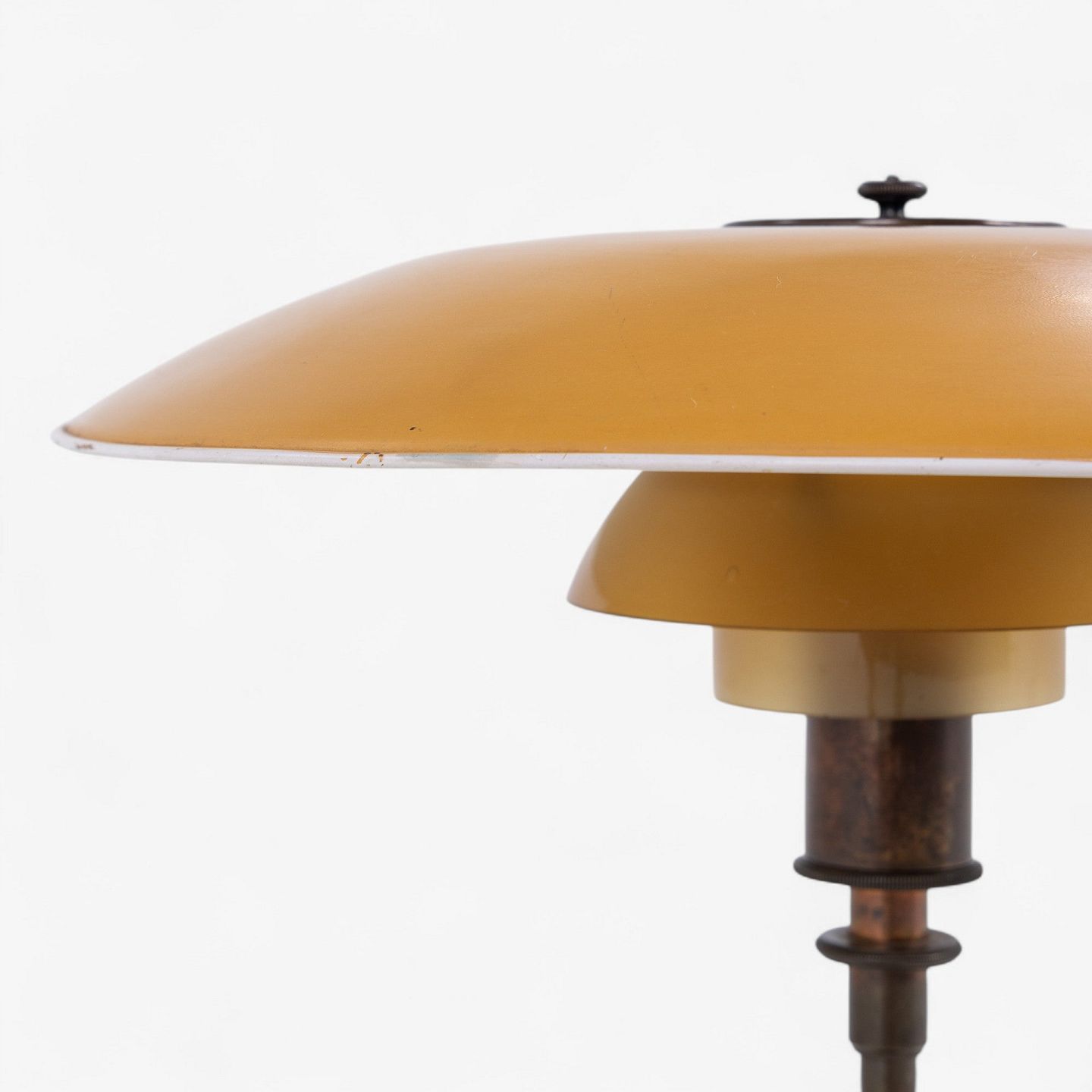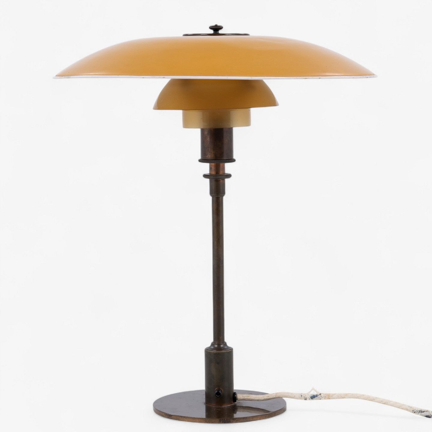 PH 3,5/2 - Bordlampe i bruneret messing med overskærm i gullakeret kobber og mellem samt underskærm i ravfarvet glas. Stemplet 'PATENTED'. Fra 1930'erne.