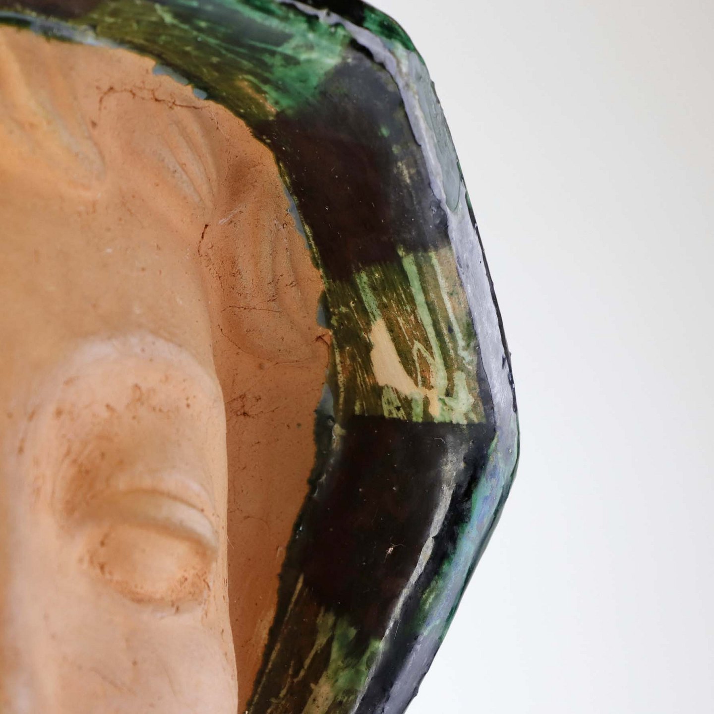 Figur i delvist glaseret keramik med motiv af kvinde med hovedtørklæde dekoreret med sorte og grønne tern.