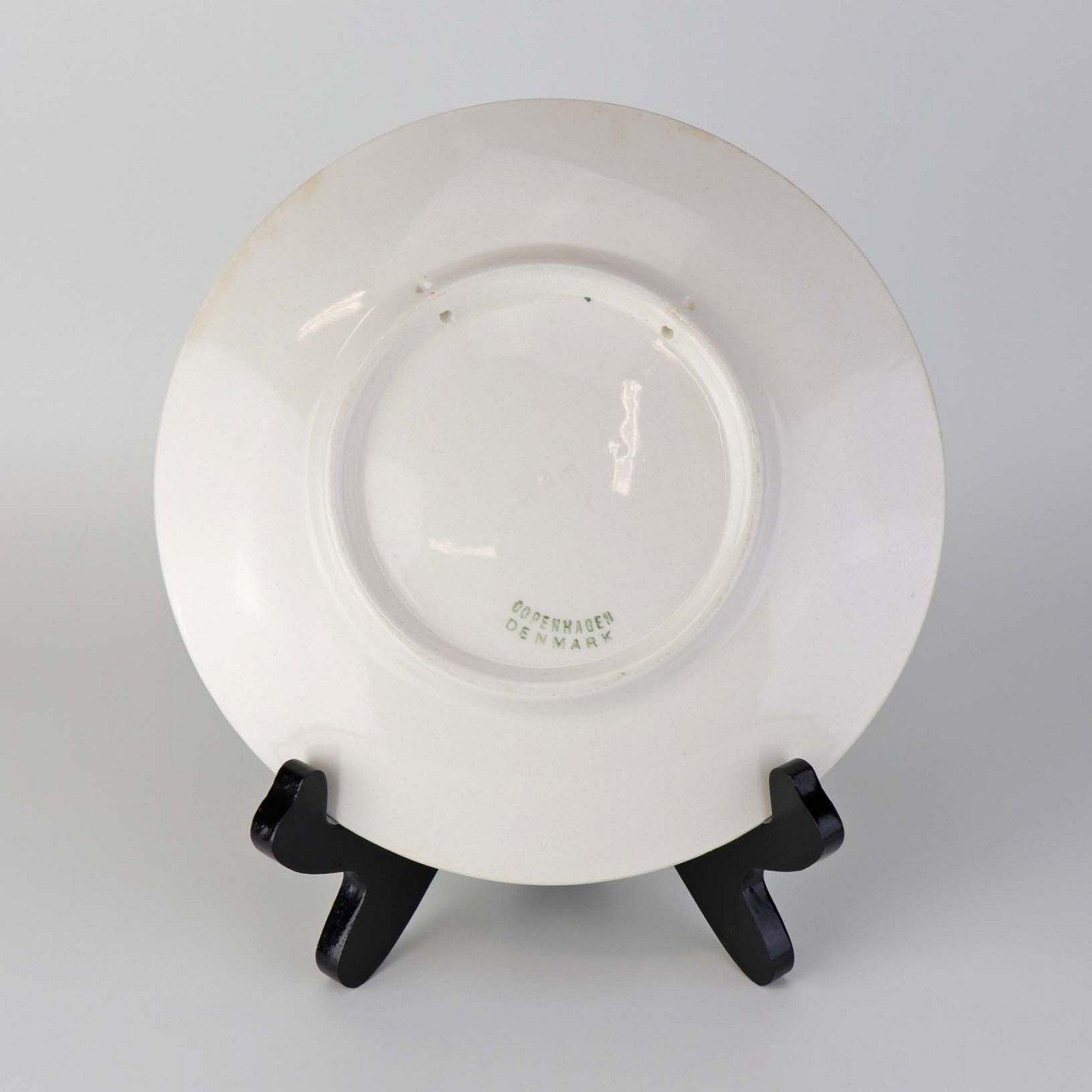 Ældre platte i fajance med teksten Viborg Amt Mejeriforening for 1ste klasses smør 1917 og motiv af fire blæseinstrumenter kaldet lur.