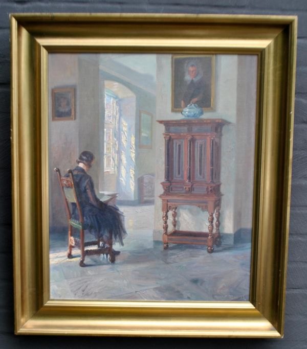 Panitzsch, Robert (1879 - 1949) Danmark: Interiør med læsende kvinde. Olie på lærred. Signeret: Pobert Pan. 1932. 62 x 52 cm. Indrammet: