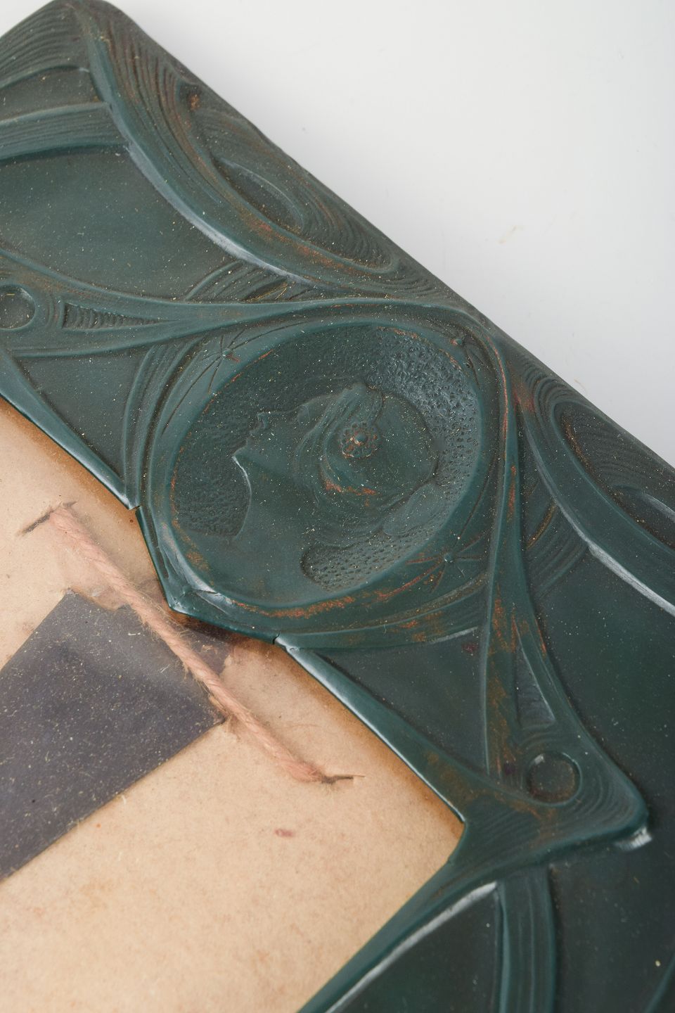 Smuk og dekorativ billedramme i grønt læder fra Art Nouveau-perioden (ca. 1890-1910). Designet prydes af en yndefuld kvindefigur i relief omgivet af bløde, organiske linjer og blomsterornamentik – et klassisk Jugendstil-motiv. Rammen har en varm gylden patina og fremstår uden bagstykke.