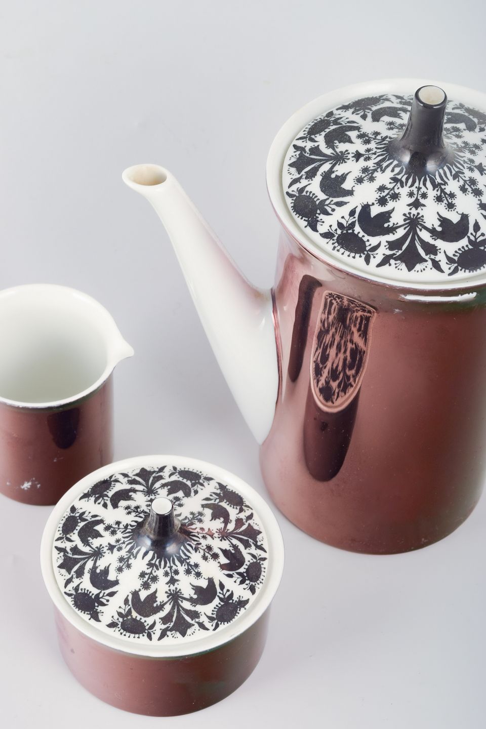 Rosenthal Studio-Line porcelænsstel bestående af kaffekande, flødekande og sukkerskål med låg. Kobberluster-dekoration på krop og låg, hvid glasur på inderside og hank/spids. Låg med sort knop og sort/hvidt grafisk mønster.