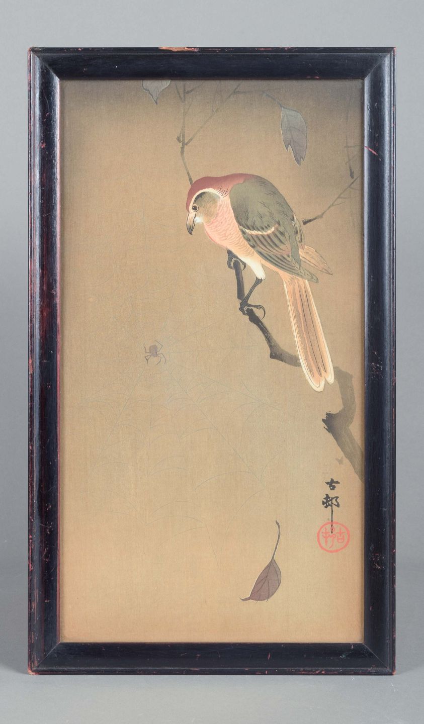 A refined work by Ohara Koson depicting a bird perched on a branch above a web with a spider. The composition combines close observation of nature with symbolic atmosphere: the bird’s intense gaze directed at the spider captures the moment between stillness and action. The delicate play of tones on the silk and the subtle colouring are characteristic of Koson’s poetic depictions of nature within the shin-hanga tradition.