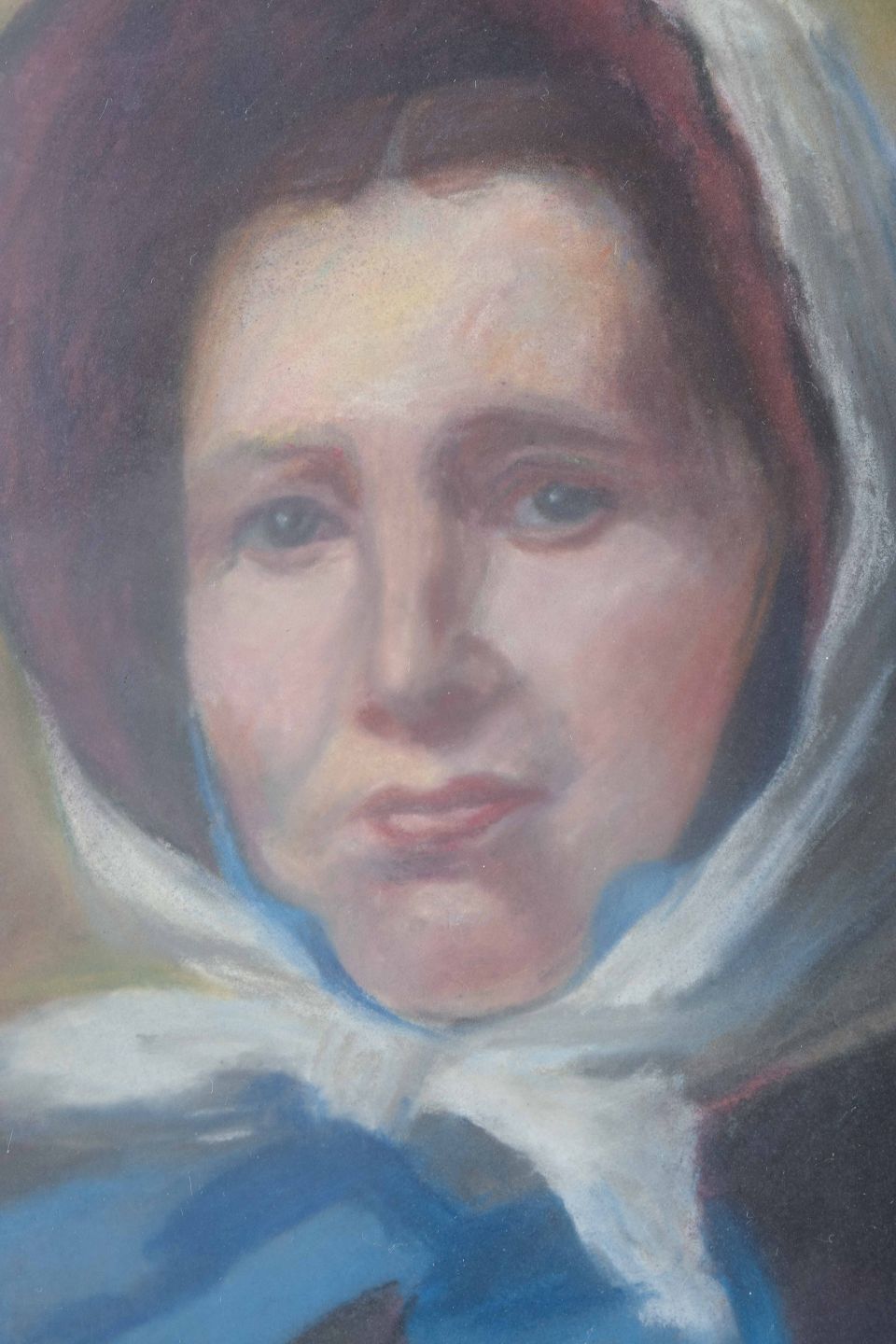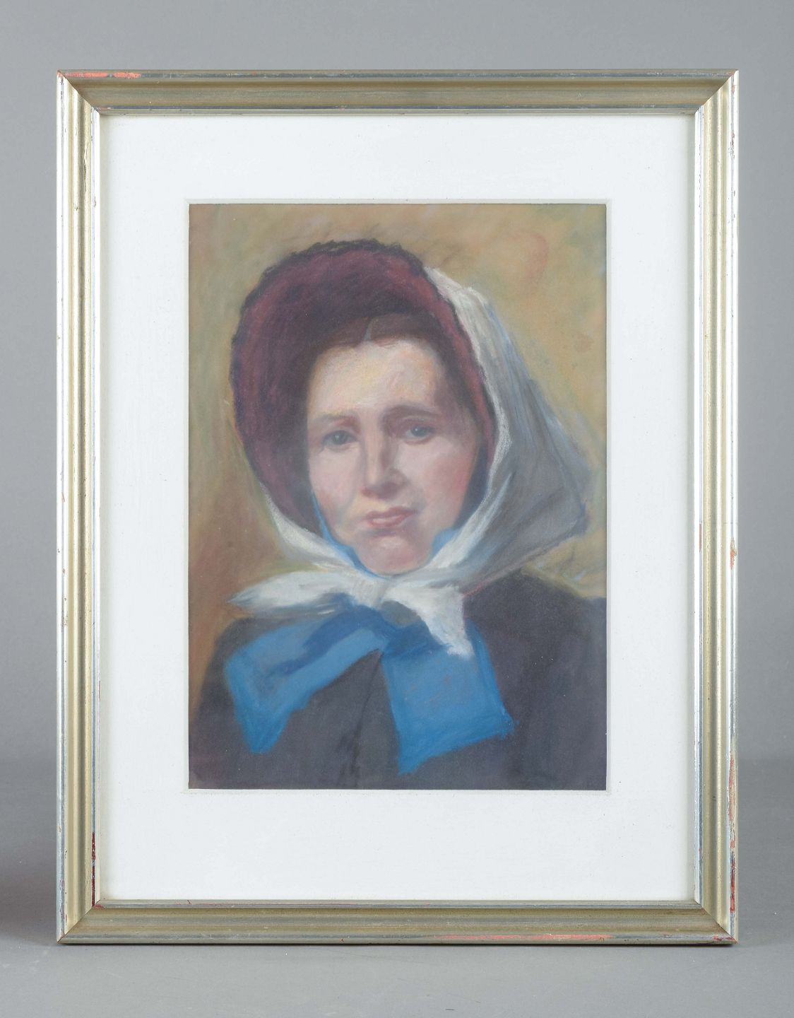 Pastel on paper. Portrait of a woman wearing a white headscarf, dark bonnet, and blue ribbon.