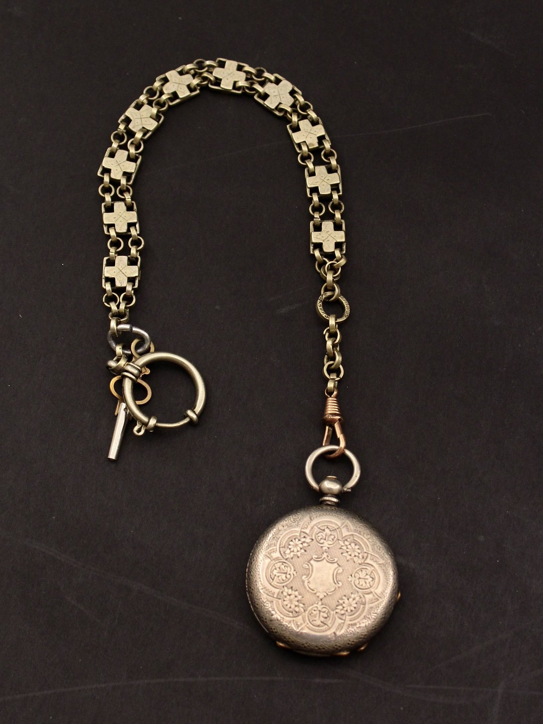 Sølvlommeur med nøgle optræk og flot urlænke uret går men trænger til rensning 19.årh. emne nr. 618047