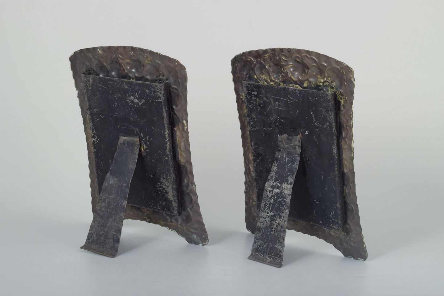 To dekorative billedrammer i præget kobber med blomstermotiver og oval åbning. Bagside med støttefod til placering på bord.