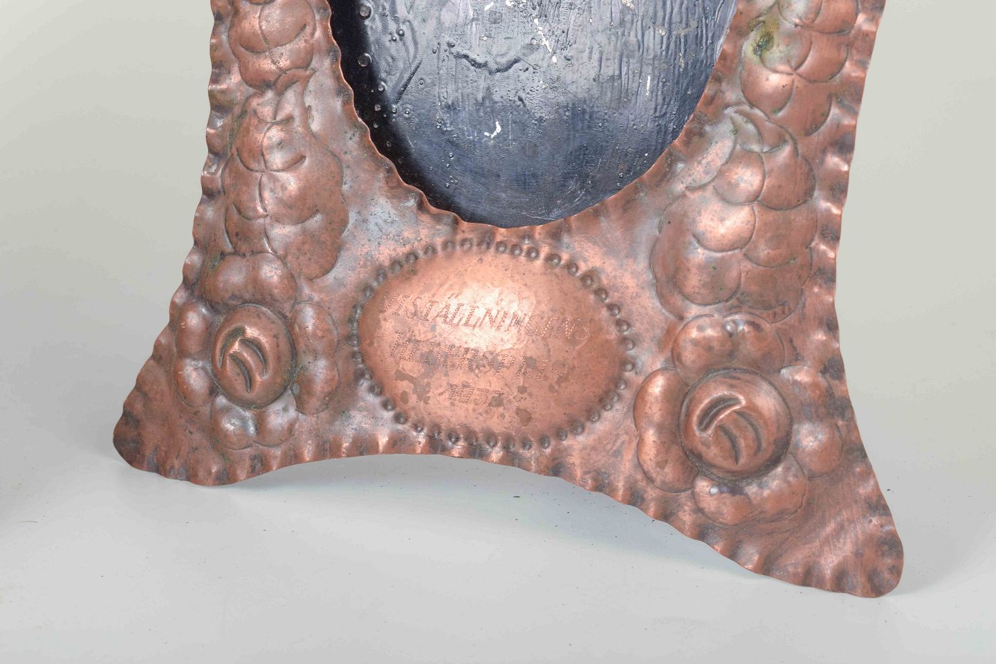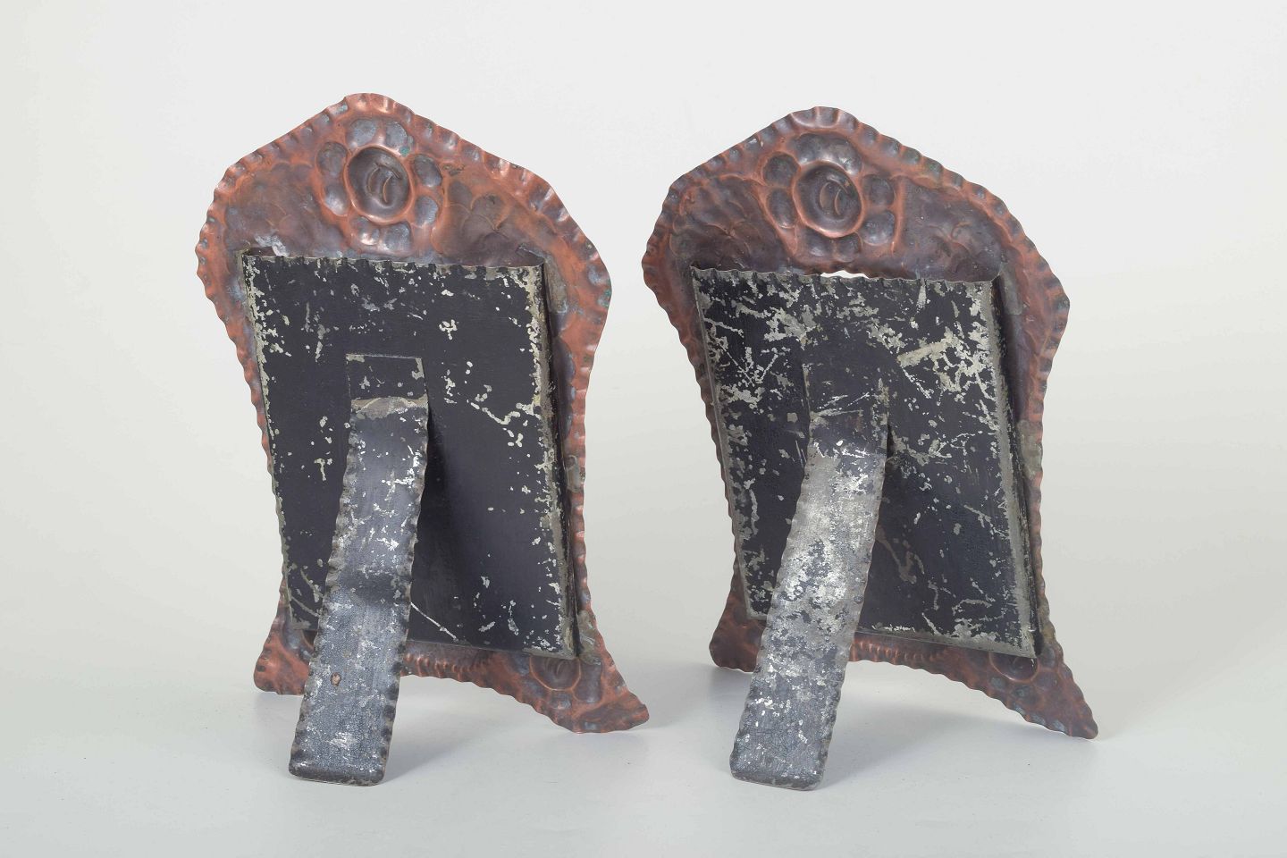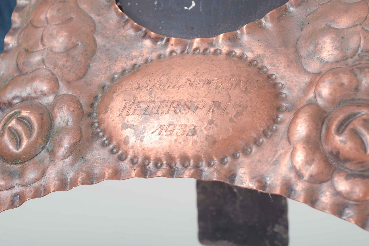 To dekorative billedrammer i præget kobber med blomstermotiver og oval åbning. Begge rammer er forsynet med indskriften “Udstillingens Hæderspris 1933”, hvilket vidner om deres oprindelse som præmier ved en udstilling. Bagsiden med støttefod til placering på bord.