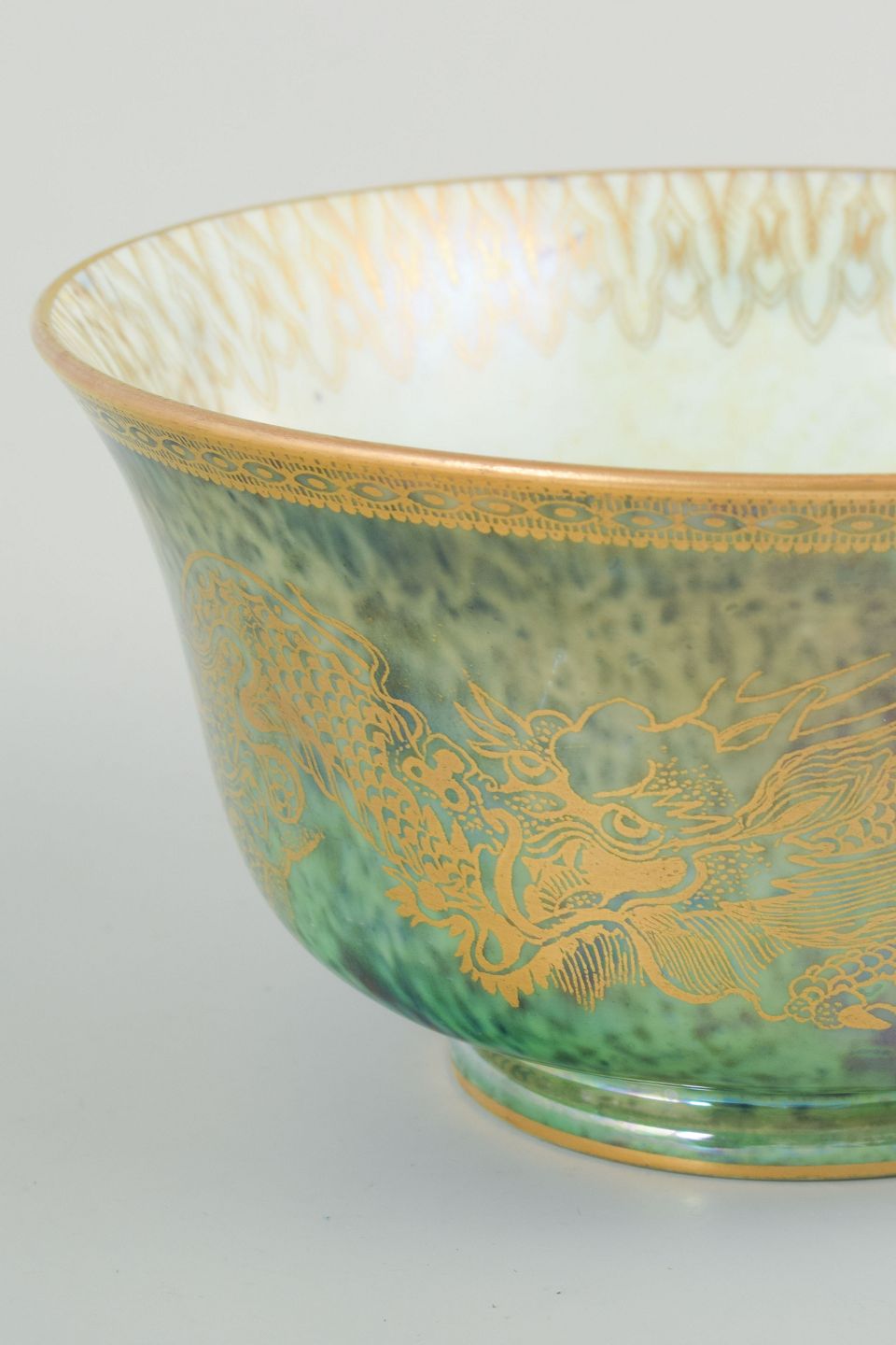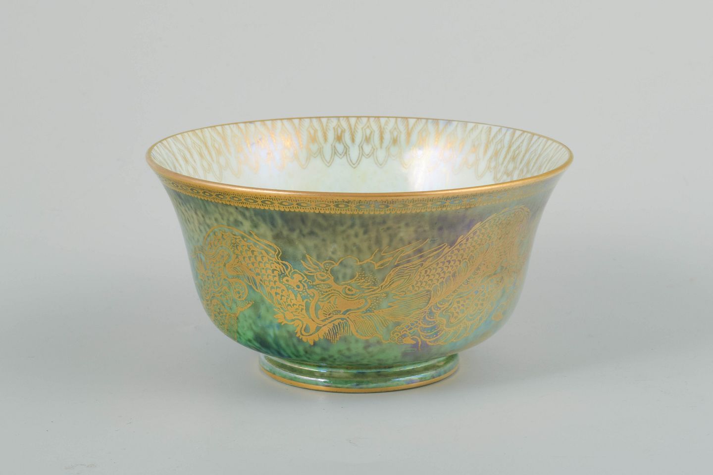 Skål i ”Lustre Ware” med grøn glasur, dekoreret med guldbemalet dragemotiv på ydersiden og fabeldyr i bunden. Indersiden med perlemorsskær og dekorativ bort langs kanten.