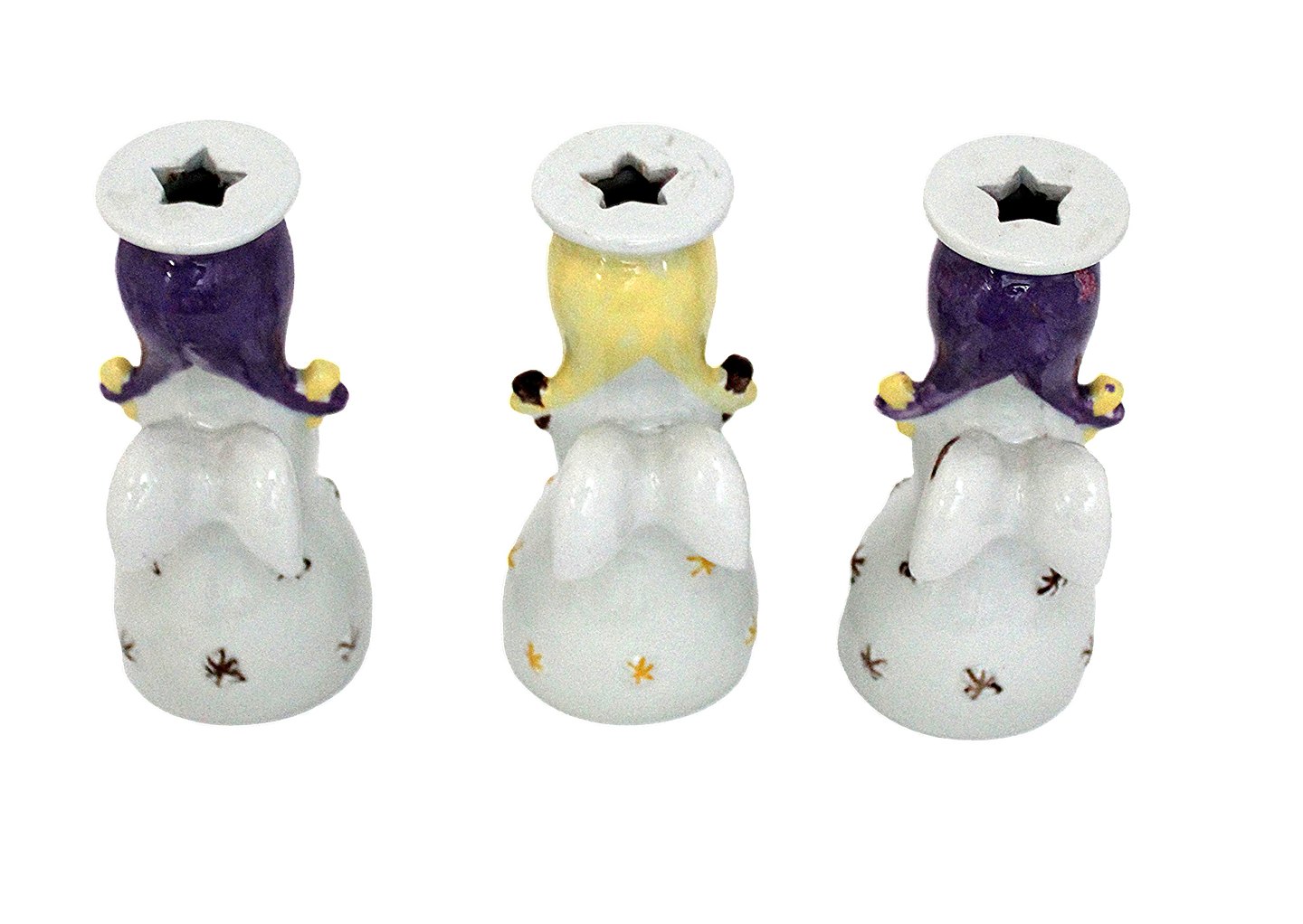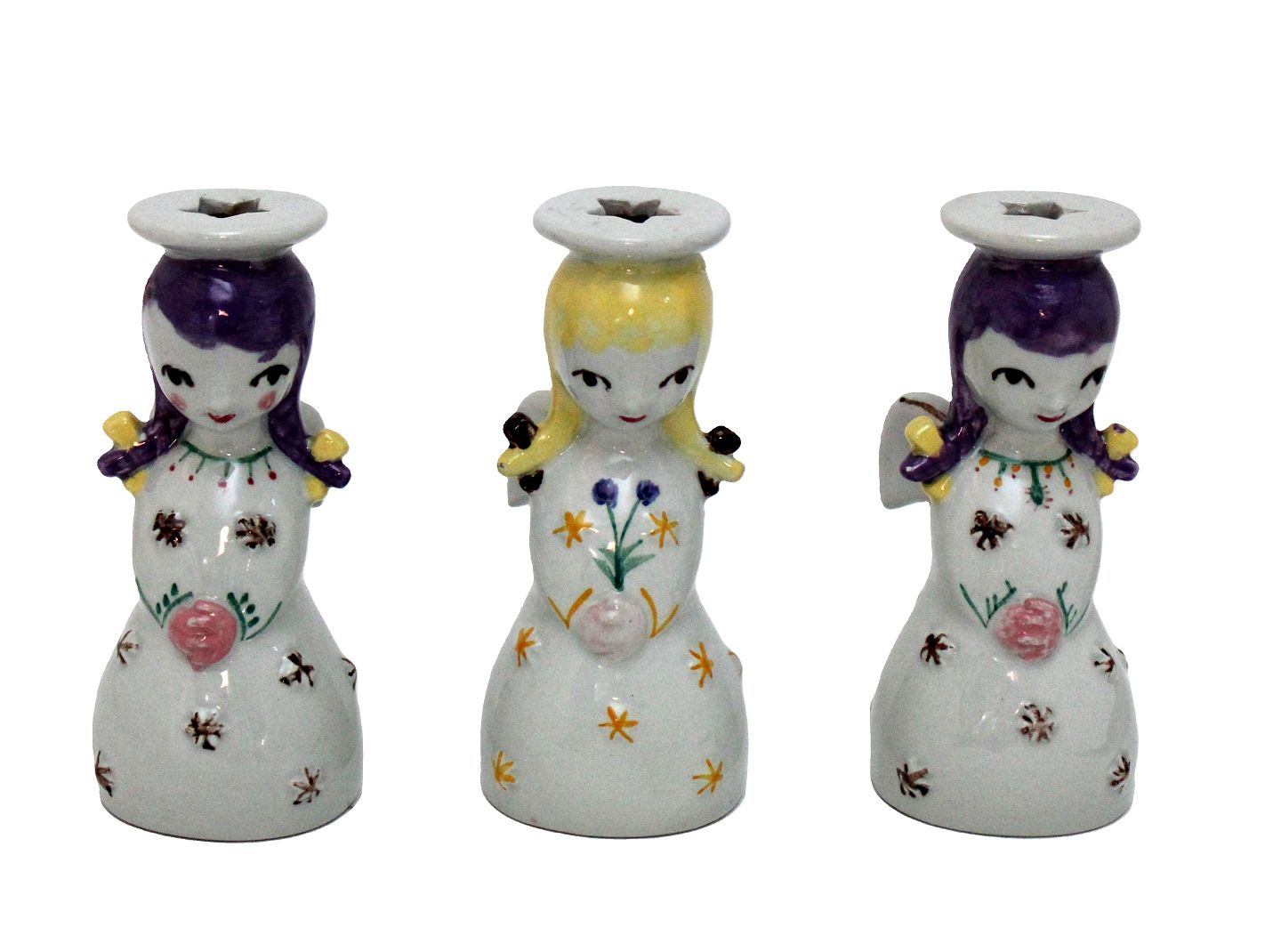 Nymølle/Knabstrup. Yderst sjældne lys engle. Formen er produceret på Knabstrup og englene er håndmalede på Nymølle. Højde 12 cm. Flot stand med få overfladekrakeleringer og minimal chip på fletninger. Den lilla farve er lidt mørkere på foto. Samler objekt. Sælges samlet. Pris: 3500 kr.