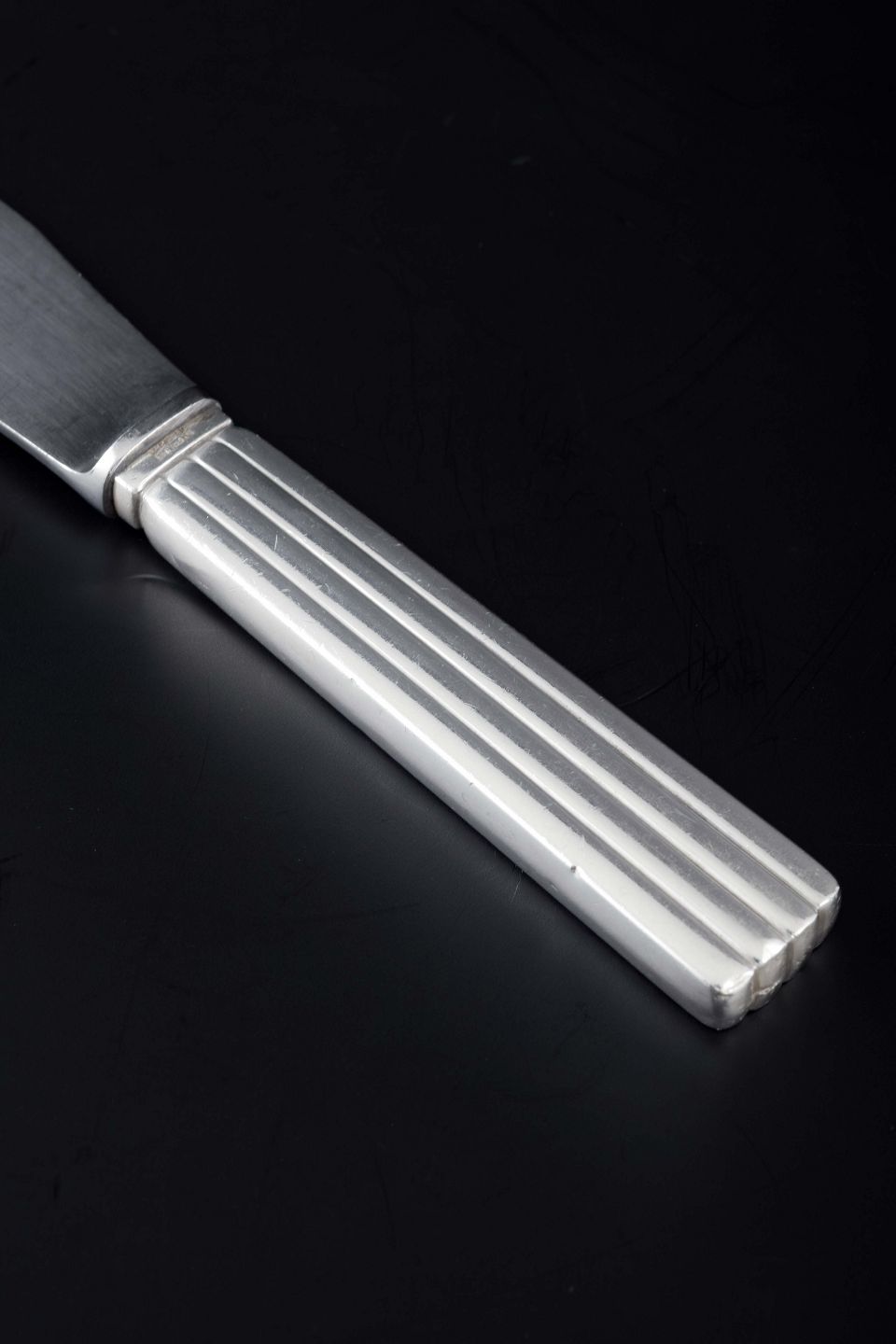 Frokostkniv i sterling sølv med blad i rustfrit stål i det ikoniske Bernadotte-mønster, designet af Sigvard Bernadotte. Det tidløse formsprog med parallelle rifler i skaftet gør bestikket til et af Georg Jensens mest populære og klassiske designs.