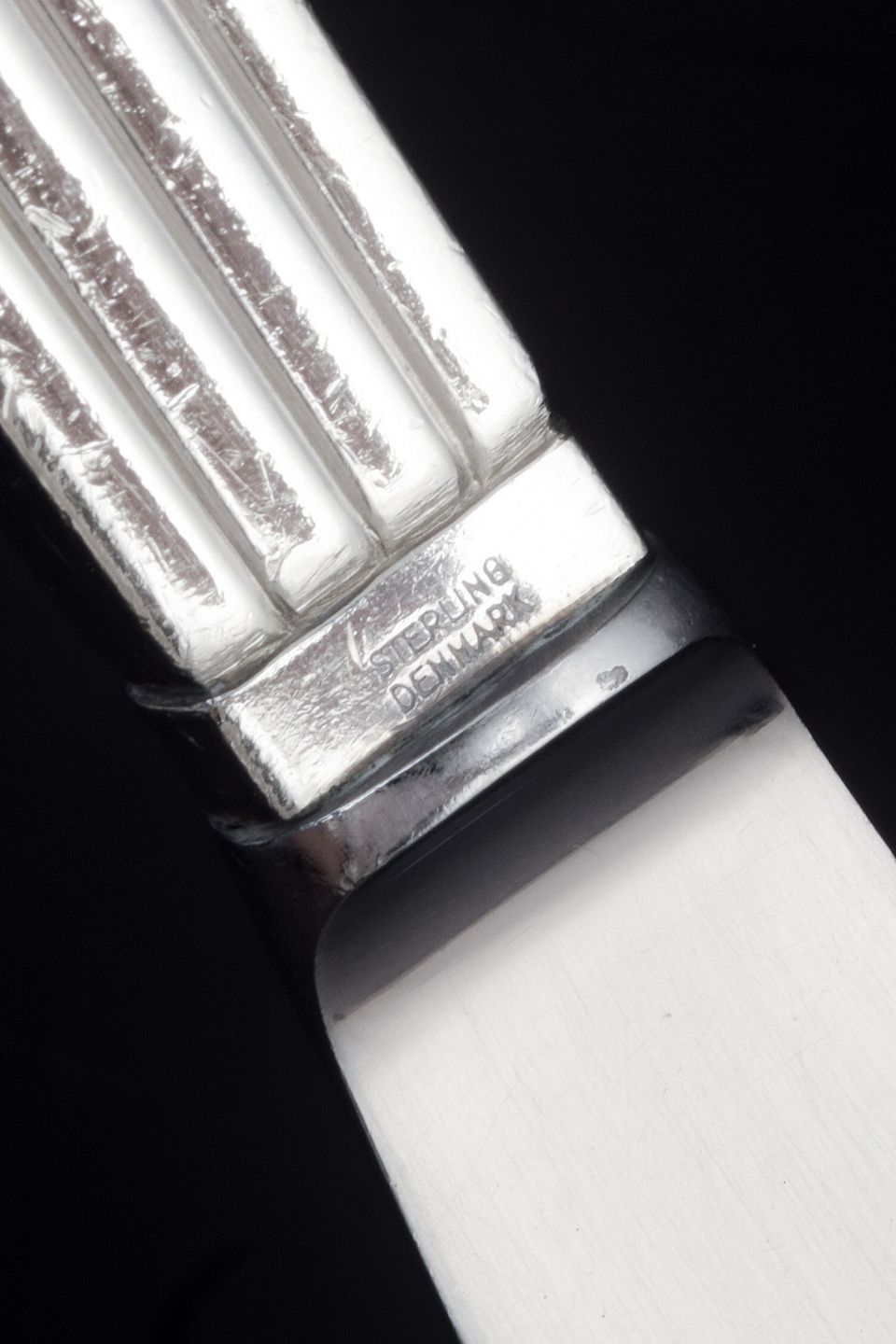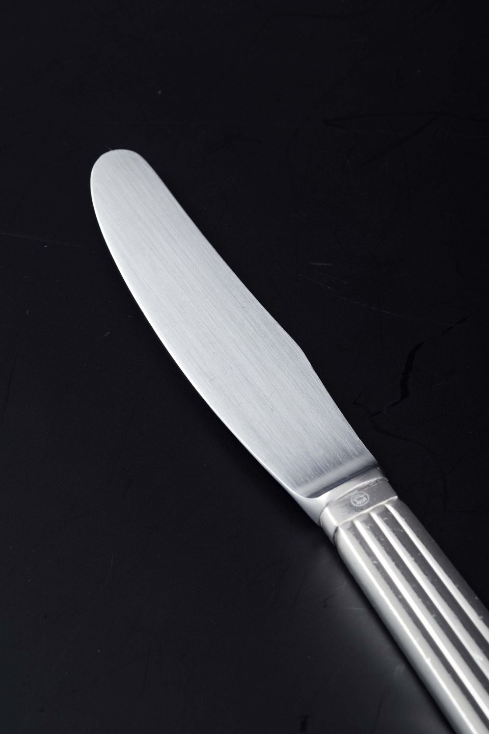 Frokostkniv i sterling sølv og rustfrit stål i det ikoniske Bernadotte-mønster, designet af Sigvard Bernadotte. Det tidløse formsprog med parallelle rifler i skaftet gør bestikket til et af Georg Jensens mest populære og klassiske designs.