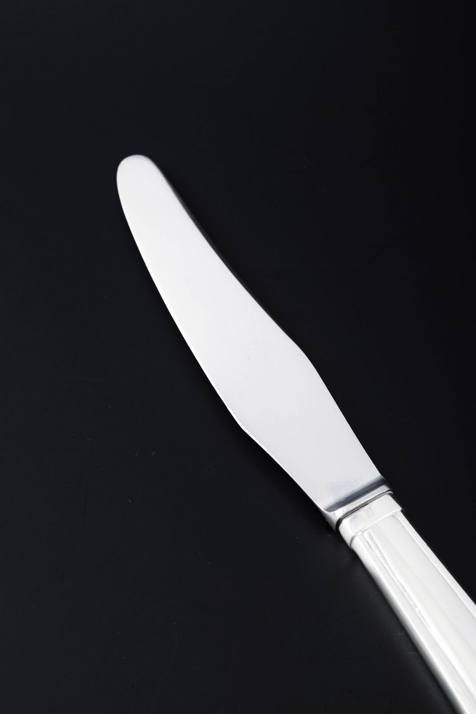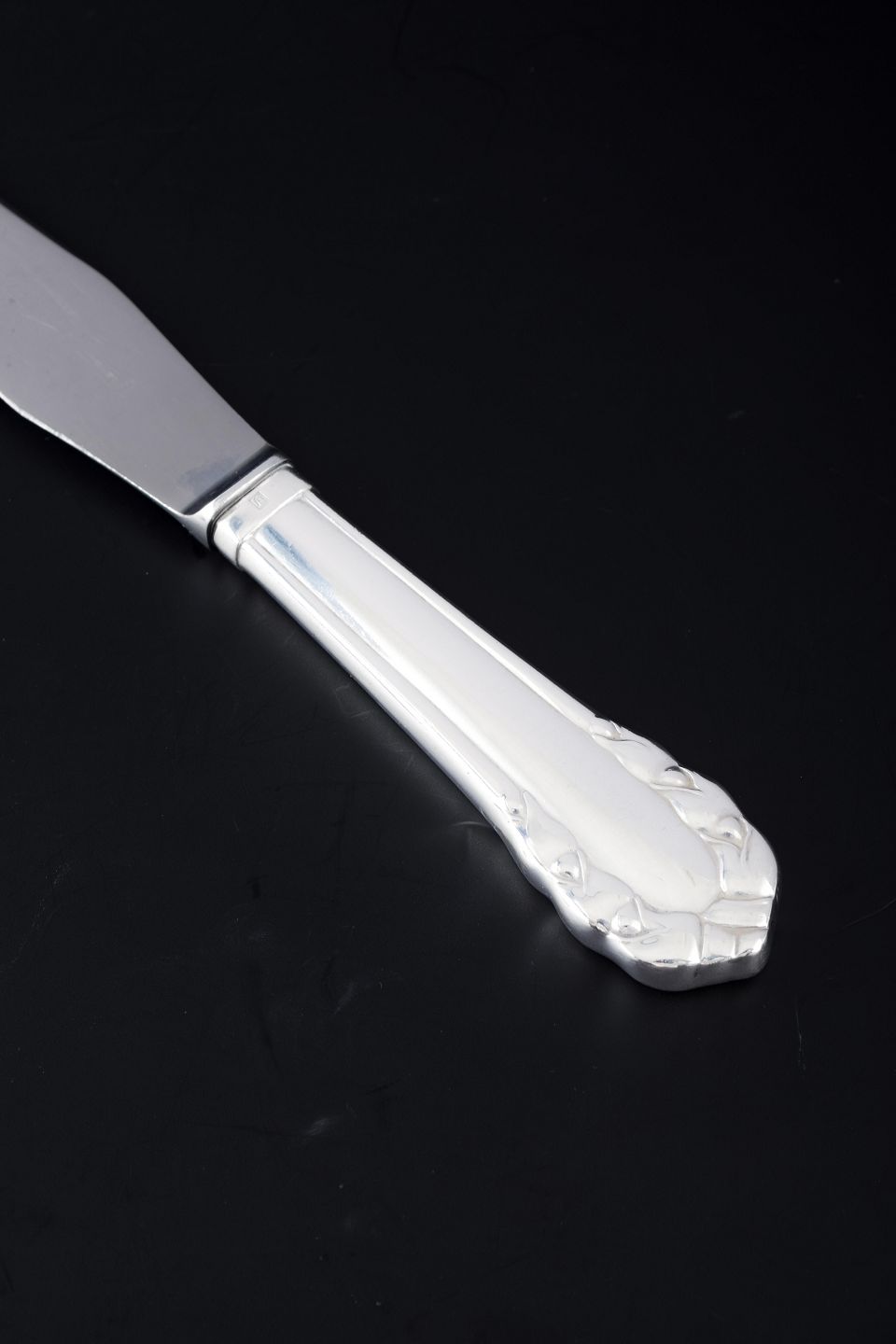 Frokostkniv i mønsteret "Liljekonval" (Lily of the Valley). Blankpoleret sterling sølv, elegant skaftafslutning med diskret blomster- og bladmotiv.