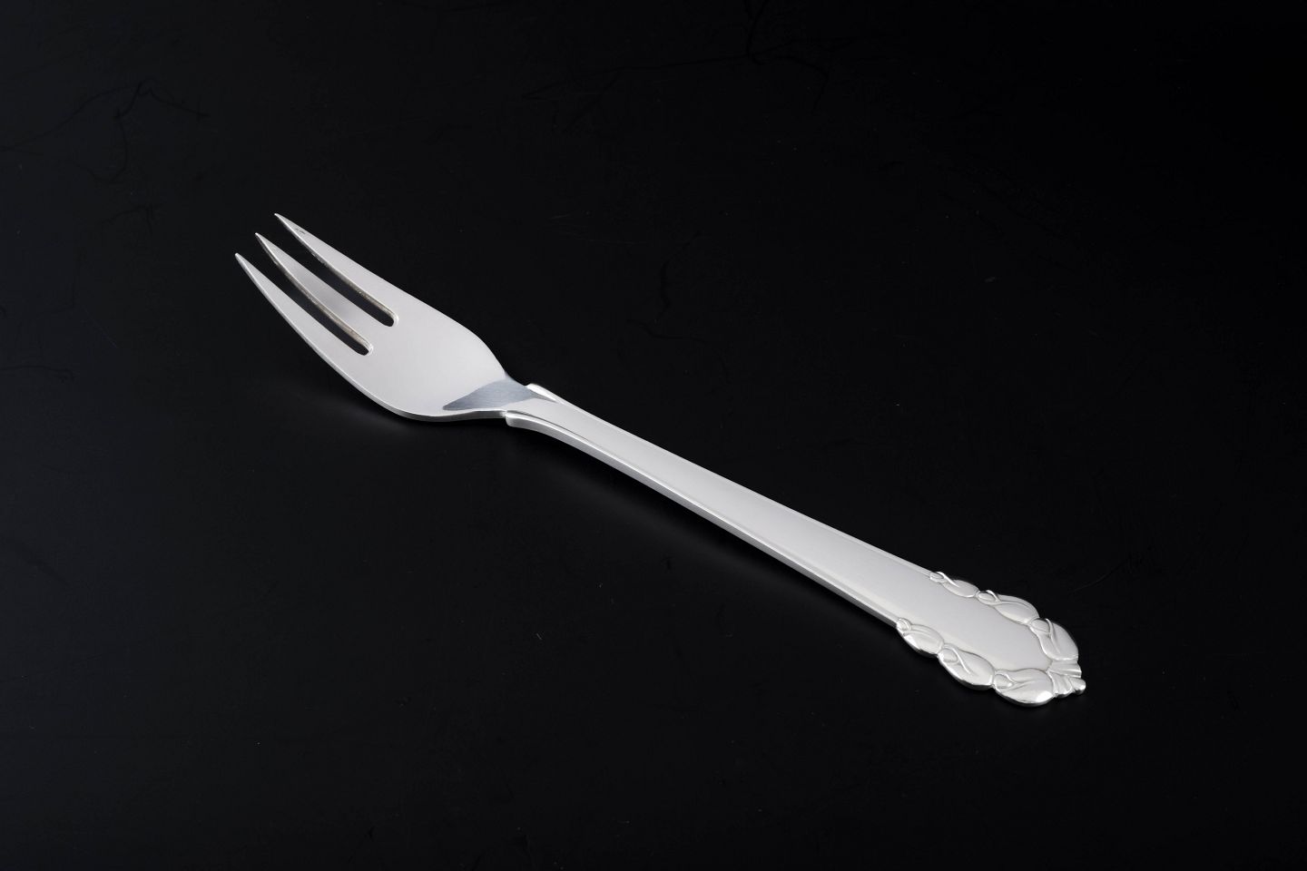 Fiskegaffel i mønsteret "Liljekonval" (Lily of the Valley). Blankpoleret sterling sølv, elegant skaftafslutning med diskret blomster- og bladmotiv.