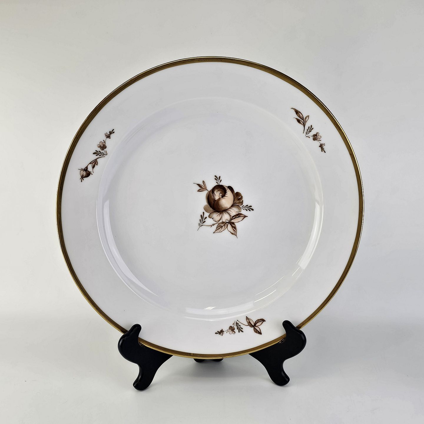 Stel i glat hvidt porcelæn dekoreret med brune roser og guldbort