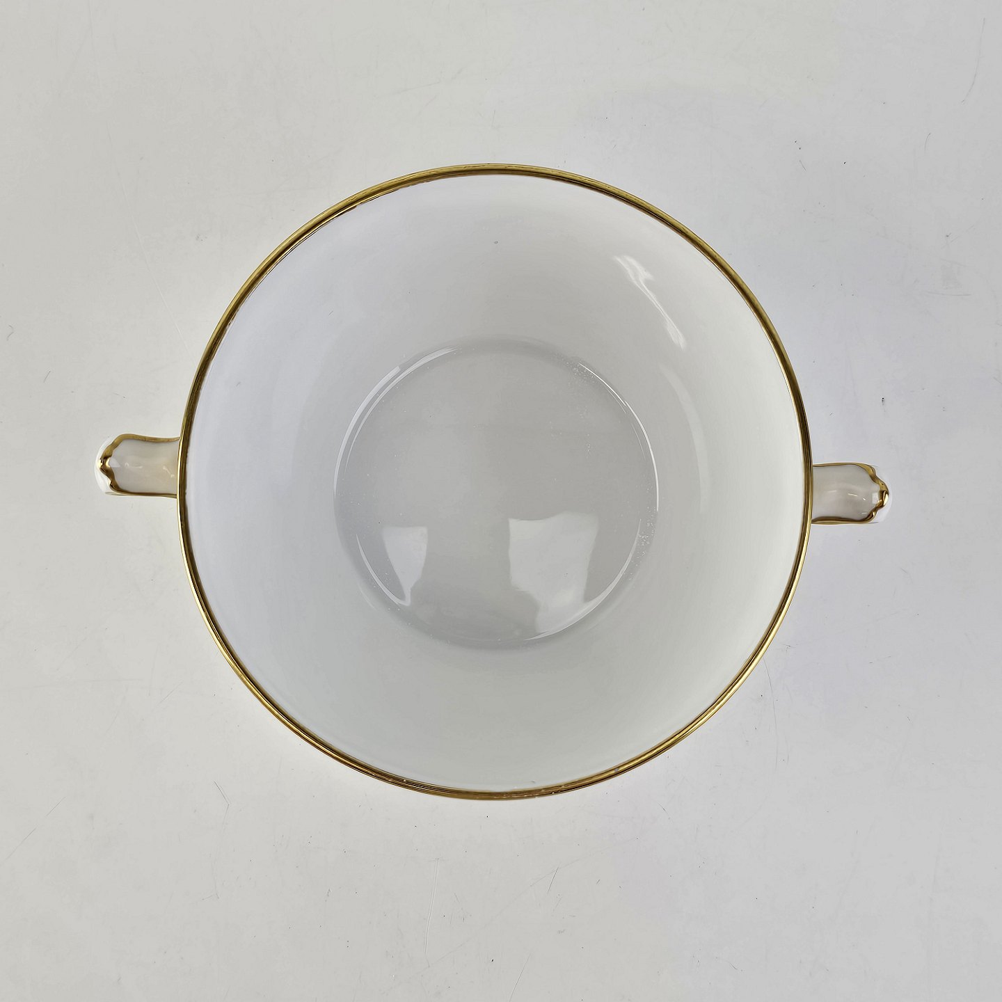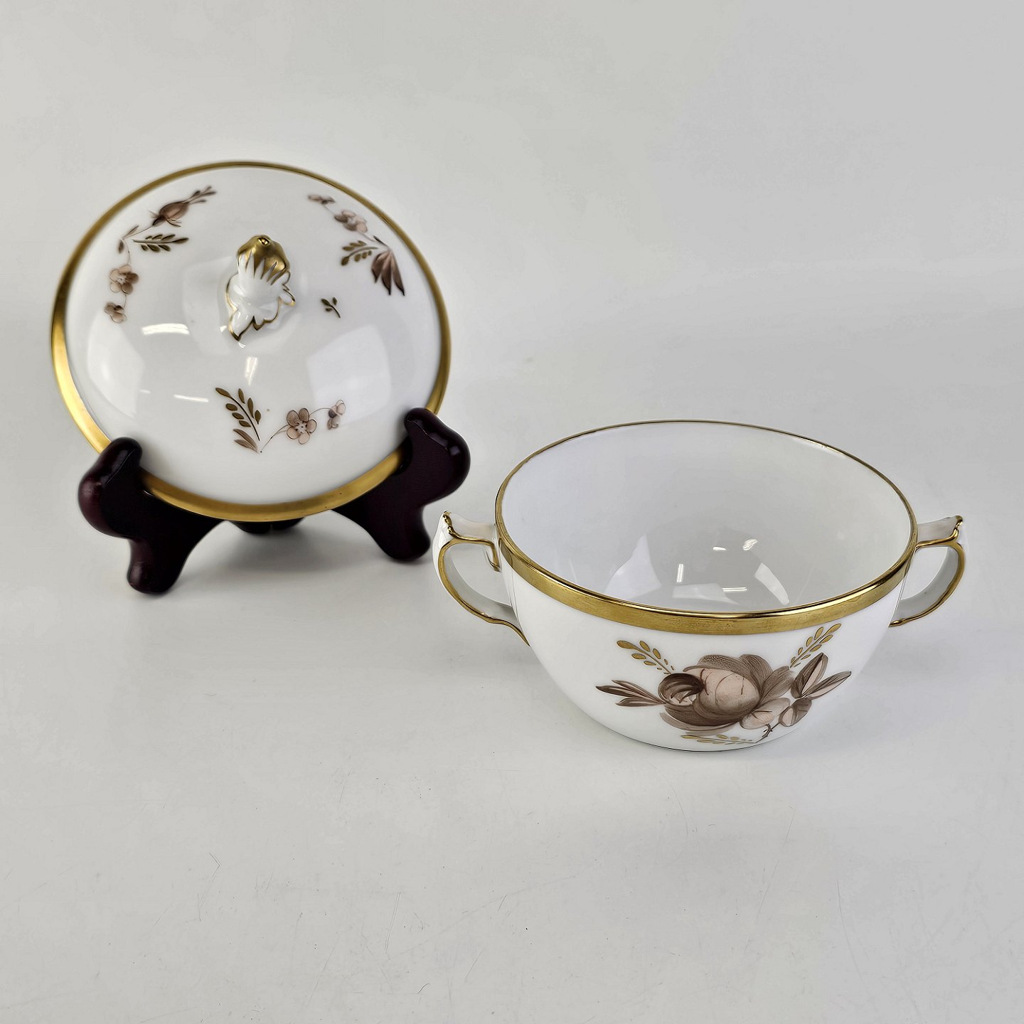 Stel i glat hvidt porcelæn dekoreret med brune roser og guldbort
