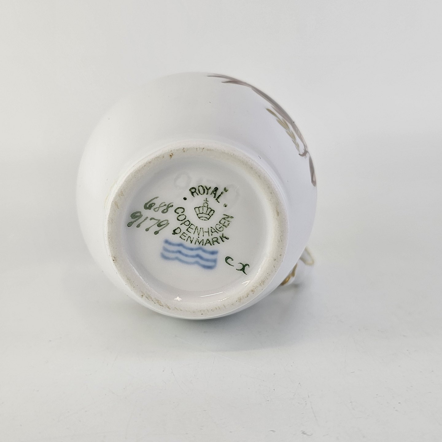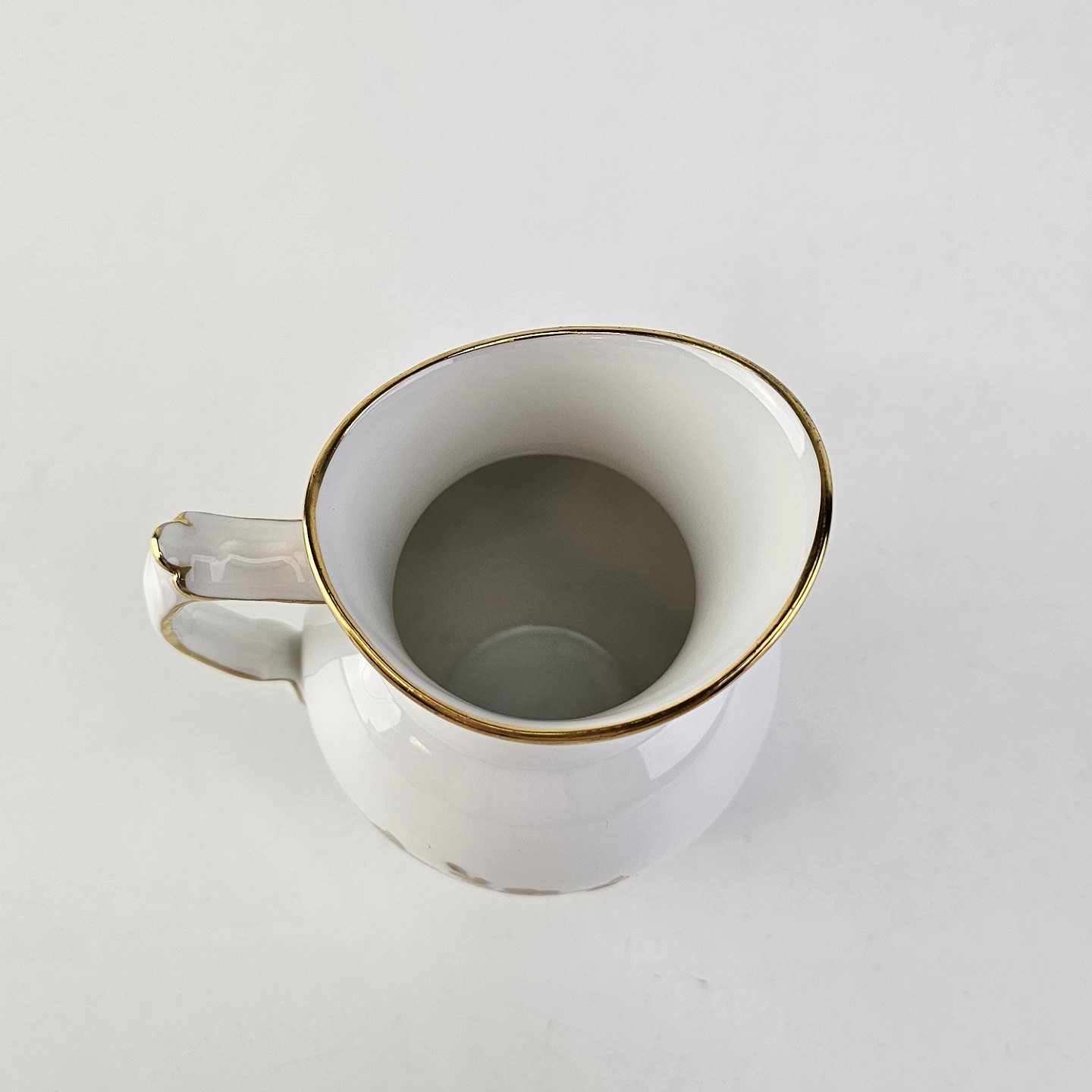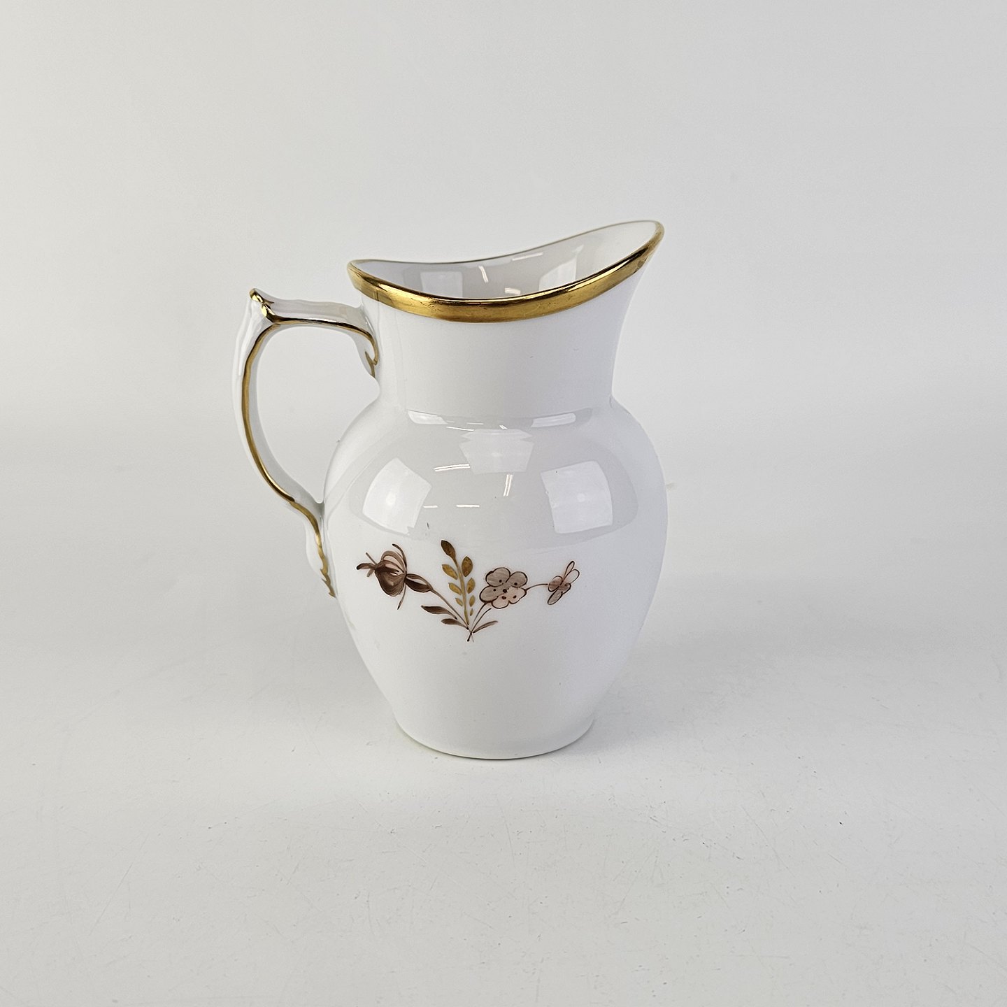 Stel i glat hvidt porcelæn dekoreret med brune roser og guldbort