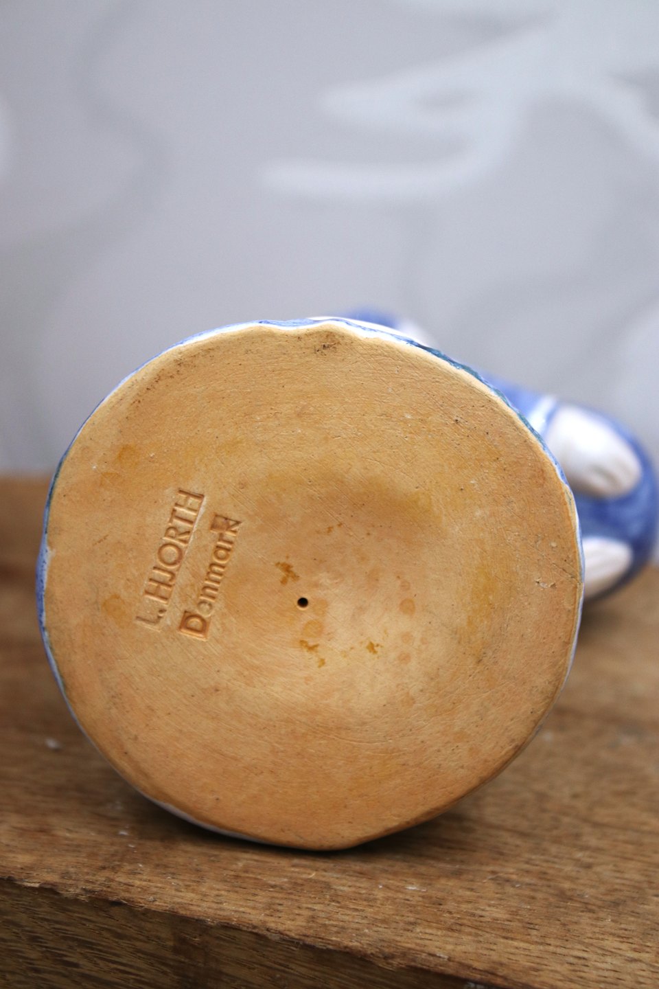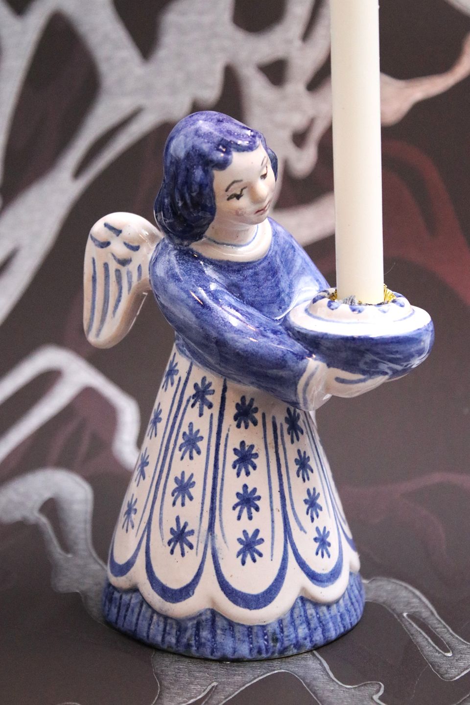L. Hjorth keramik stor engel med blå / hvid glasur