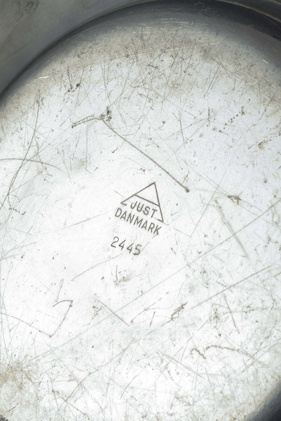 To fade i tin, det ene med riflet kant, det andet med enkel profilering. Stemplet med trekantet mærke "JUST DANMARK" samt modelnummer 2445.