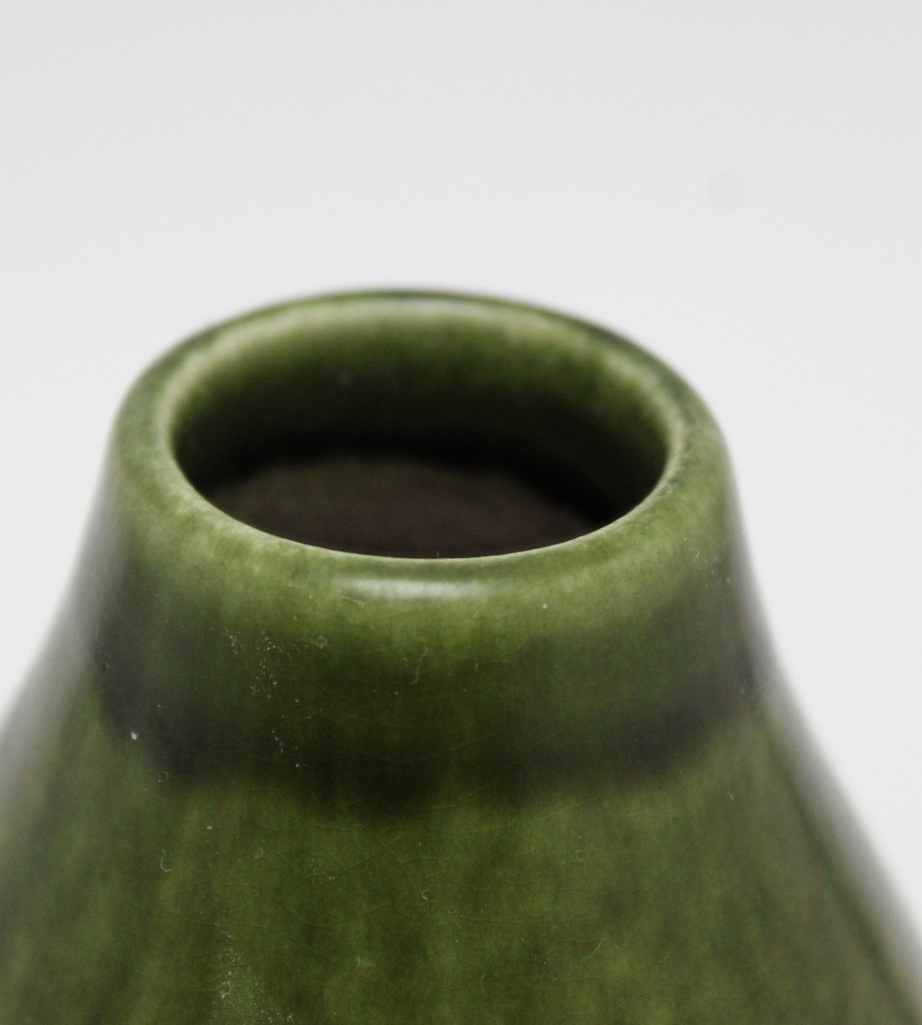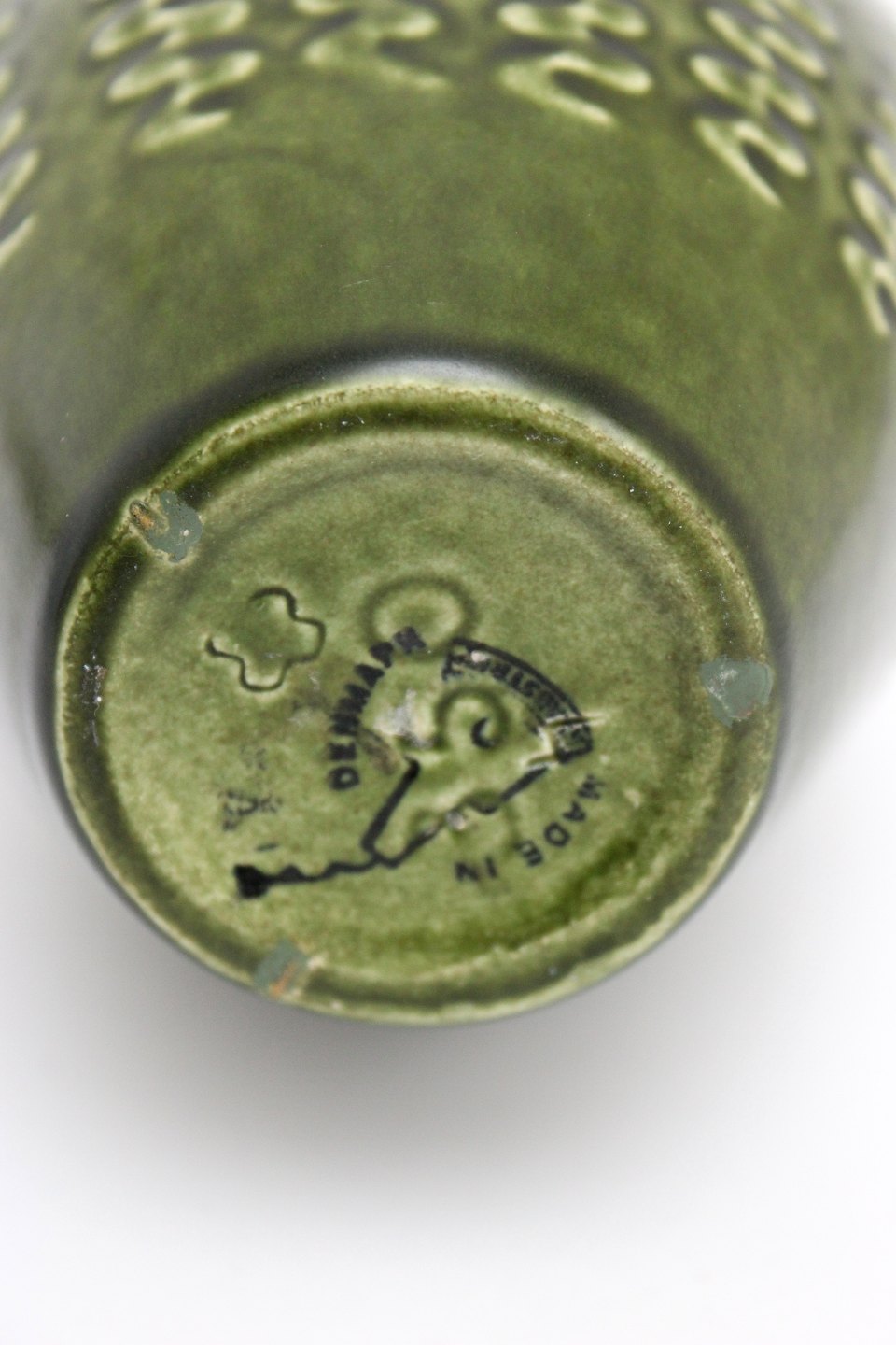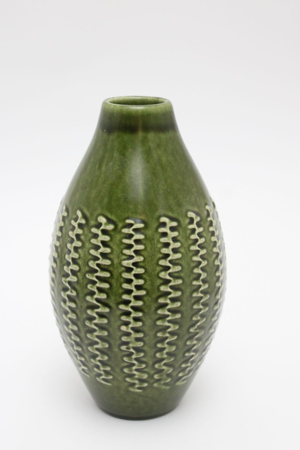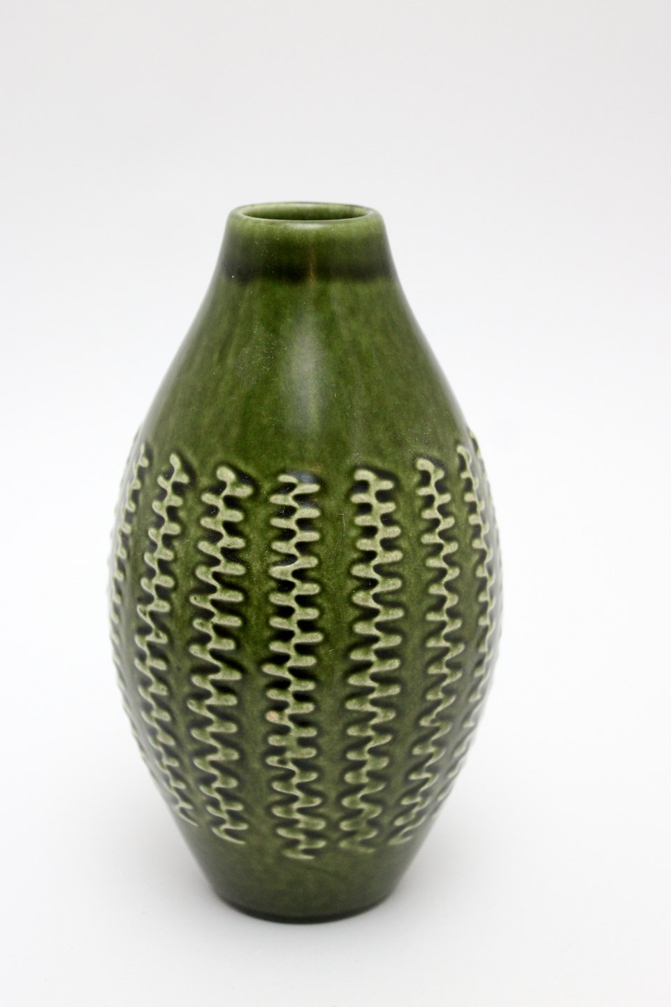Knabstrup, Kreta serien. Smuk sjælden vase i grønt keramik med dekorative hvide relief striber. Designet i 1950'erne. Højde 18 cm. Midterste diameter ca. 9 cm. Stempel med skorsten Knabstrup og Made in Denmark. Meget flot stand. Pris: 1200 kr.