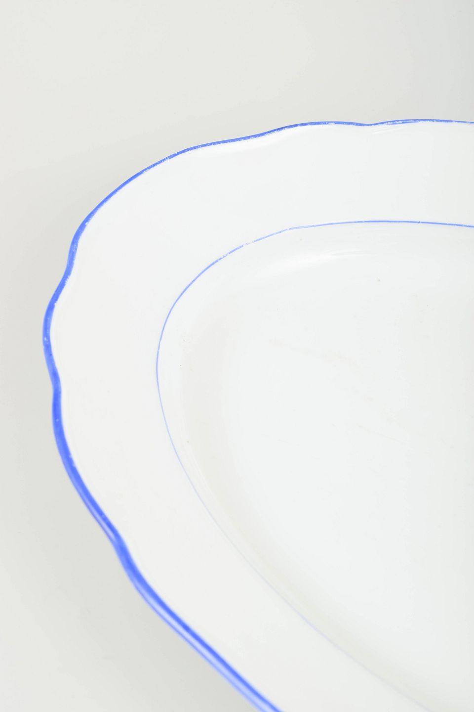 Serveringsfad i hvidglaseret porcelæn med bølget kant og blå staffering.
