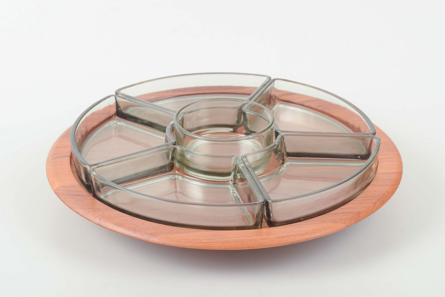 Et klassisk cabaretfad fra Digsmed, bestående af en drejet teaktræsplade med otte indsatsfade i glas. Et funktionelt og dekorativt serveringsfad, der forener tidstypisk skandinavisk teakdesign med enkel, organisk formgivning.