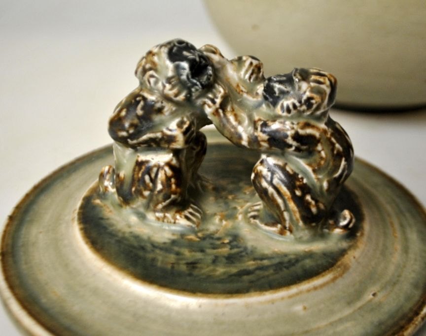 Lagkrukke i stentøj med sung glasur. På låg to aber. Stemplet: Monogram 1962. 1. Sortering. H.: 16 cm. Dia.: 17 cm