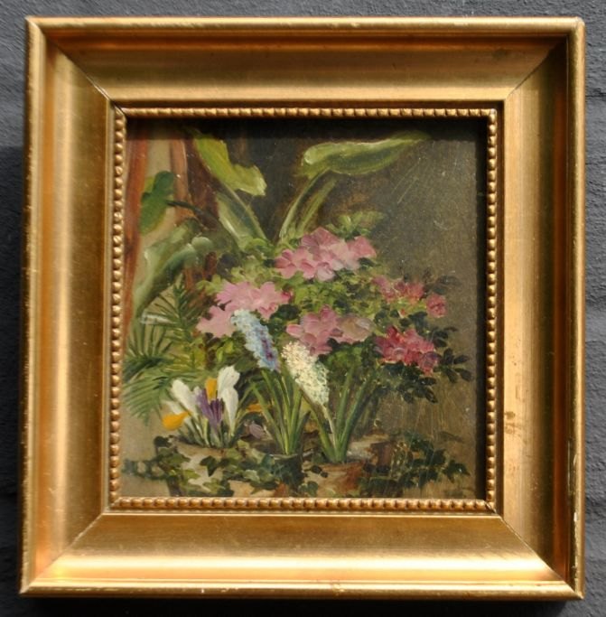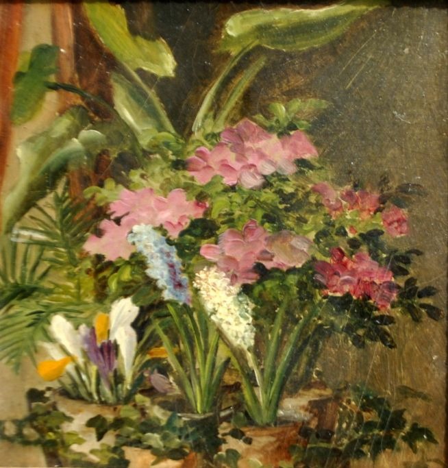 Dansk kunstner (19. årh.): Blomstrende potte planter på et bord. Olie på pap/opklæbet på pap. Usigneret. 13 x 12,5 cm.