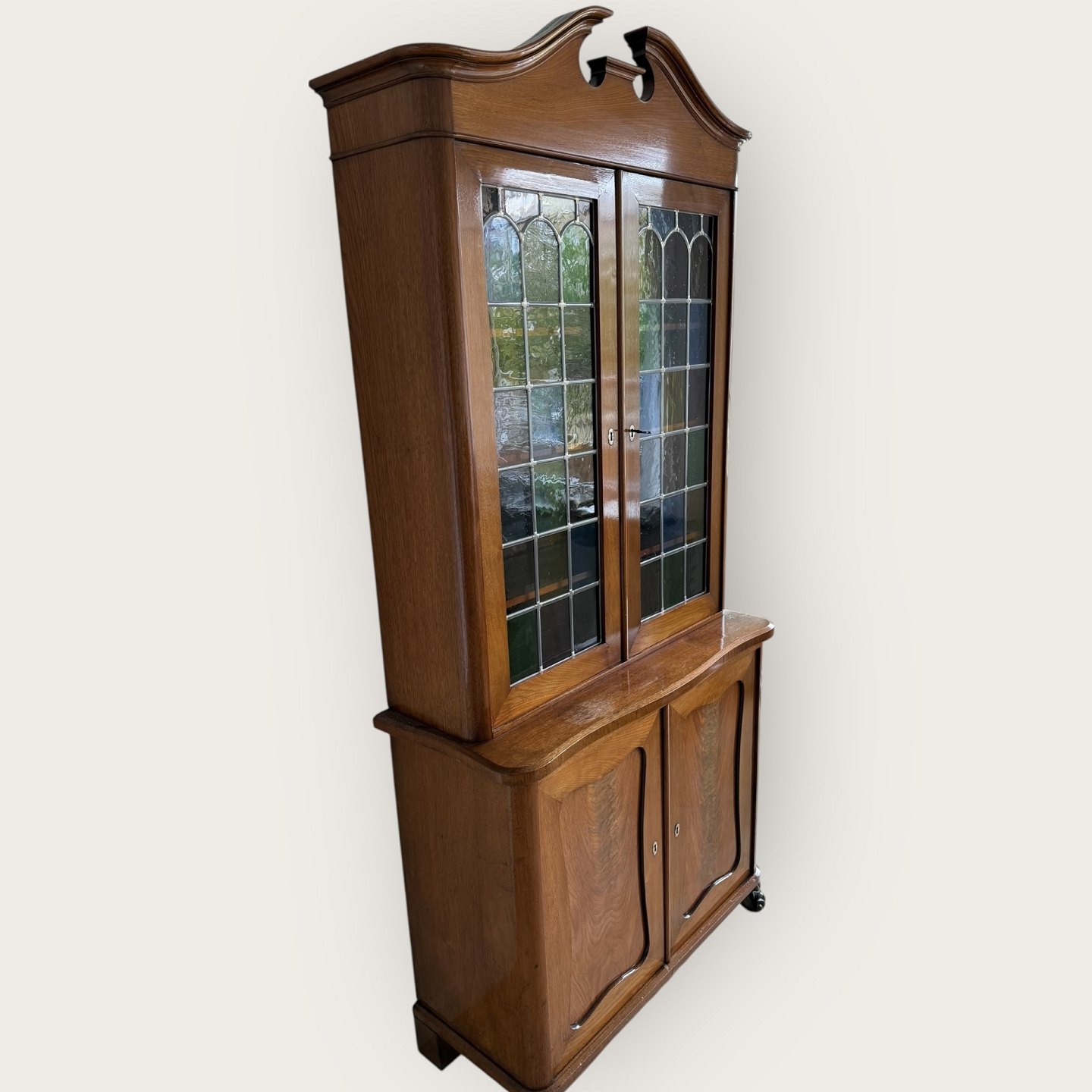 Dækketøjs skab i mahognifiner, overdel med farvede blyindfattede glas samt lys, Fremstår i fin brugt stand, Mål: HxBxD 198x90x39cm