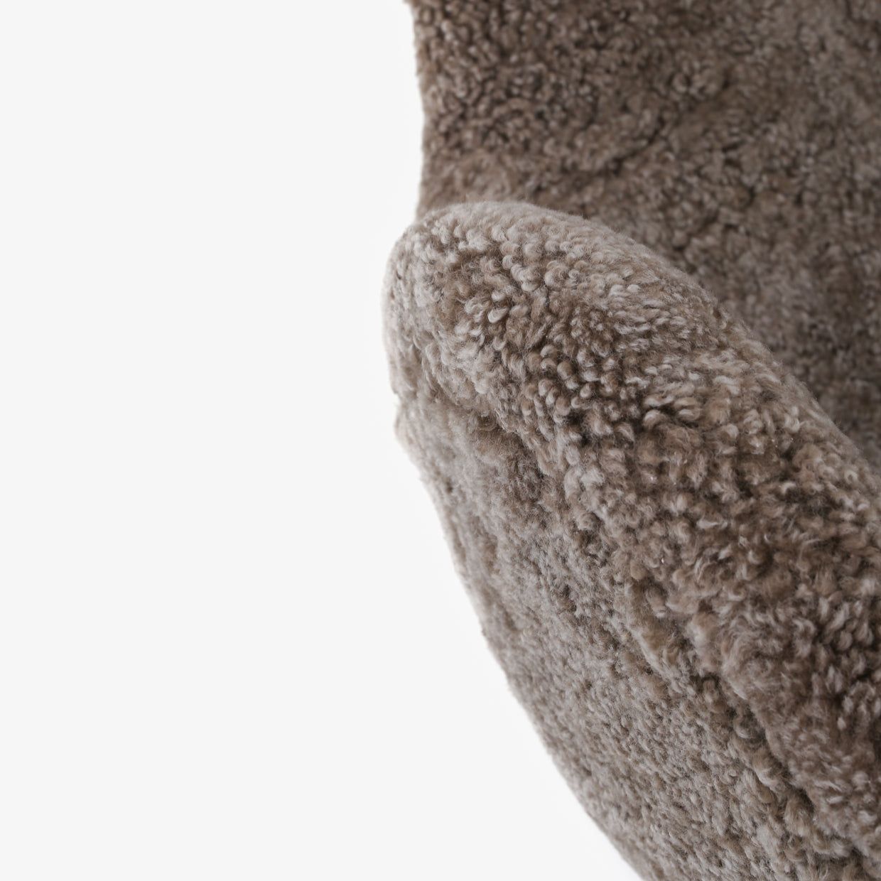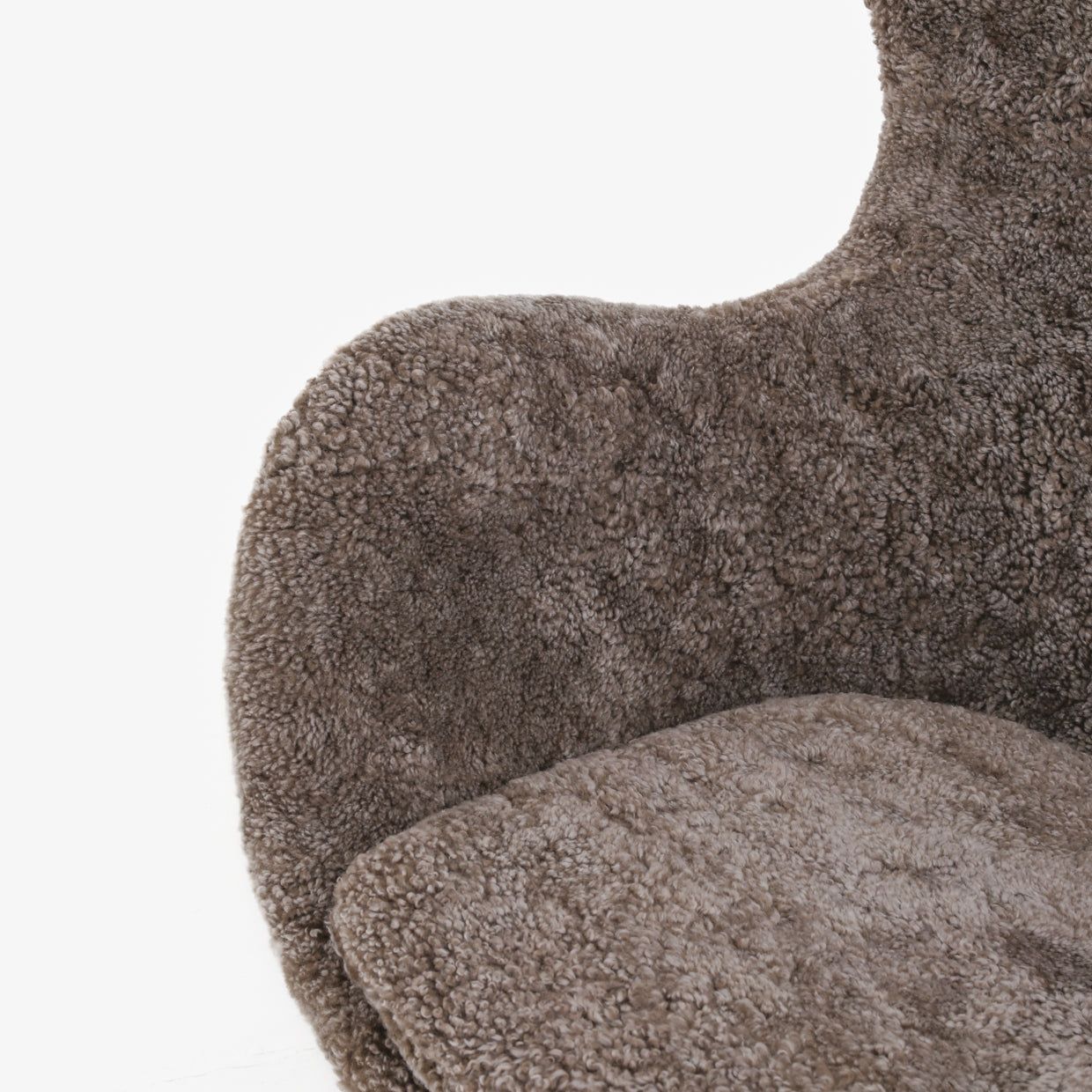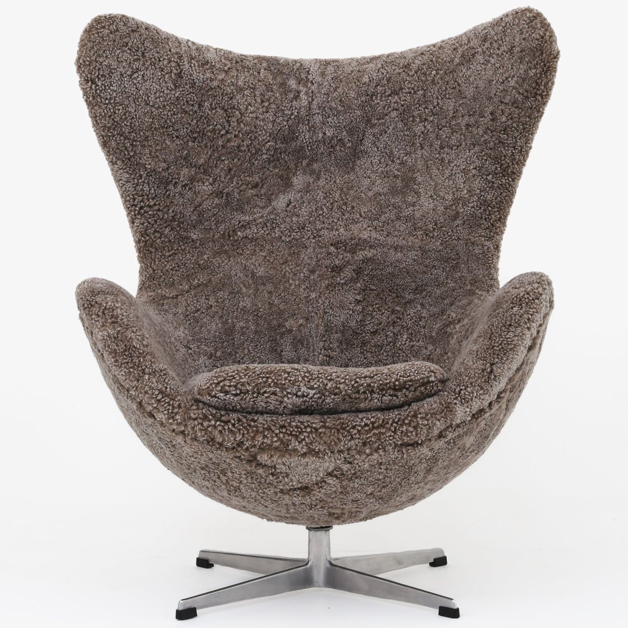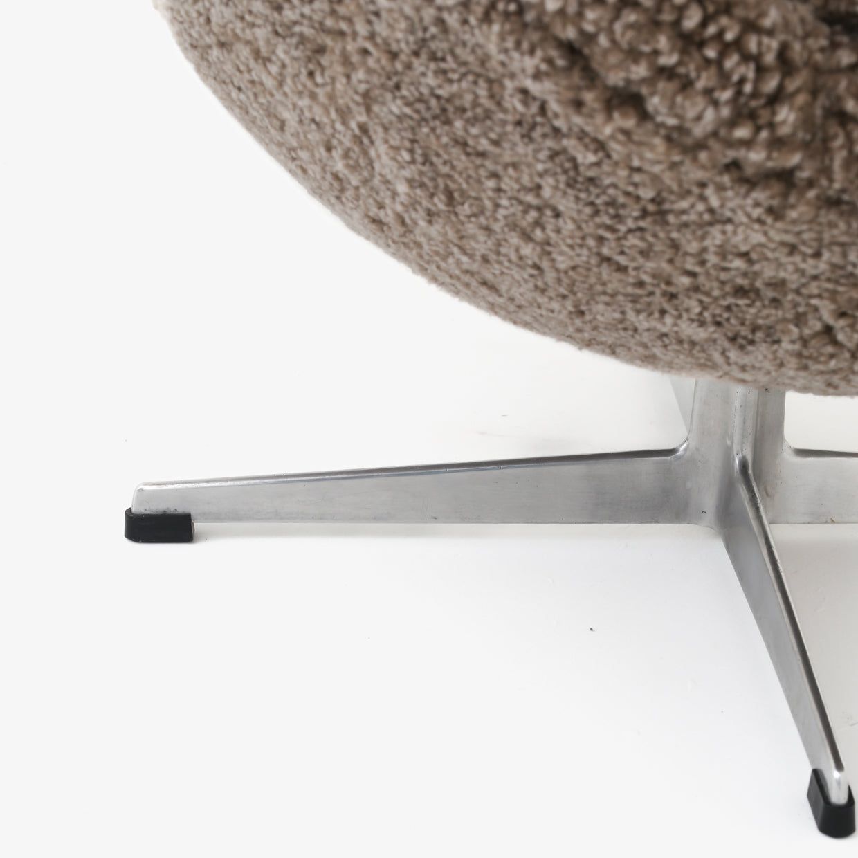 AJ 3316 - Nybetrukket 'Ægget'-lænestol med skammel i lammeskind med (Sahara 07, Curly 17mm) med helstøbt aluminiumsfod.