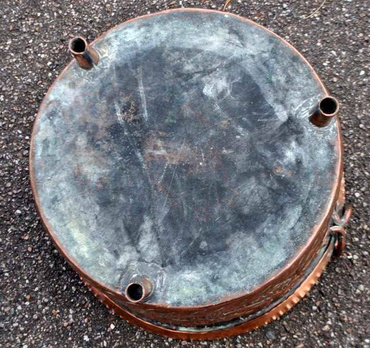 Brændespand, Haraldskjær Kobber Fabrik, Vejle, 19. årh. Danmark. Med tre ben og to hanke. Med tarige bankede dekorationer på siden. H.: 29 cm. Dia.: 40 cm.