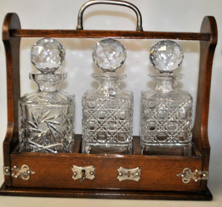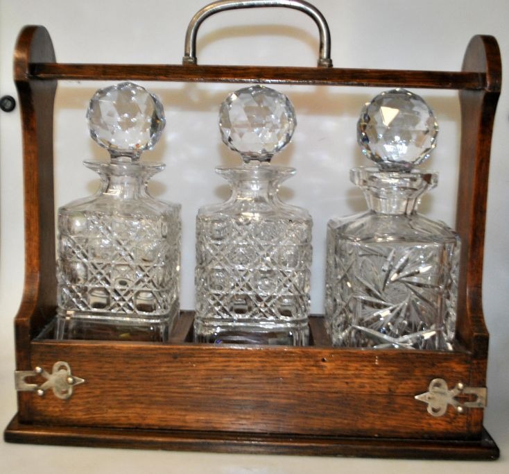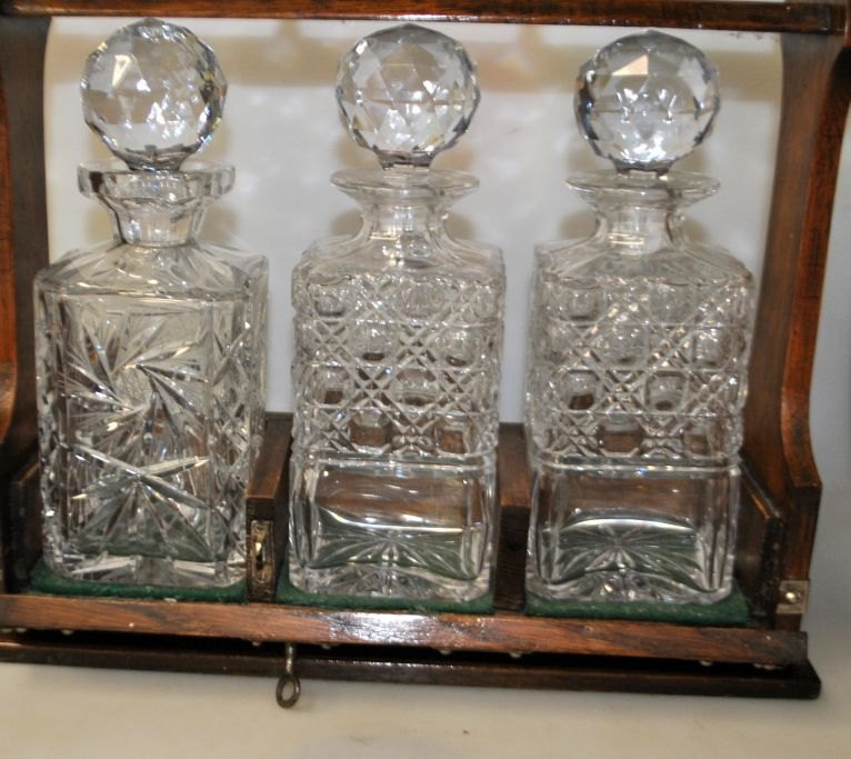 Tantalus af egetræ med tre karafler af krystal med propper. England. 19. årh.