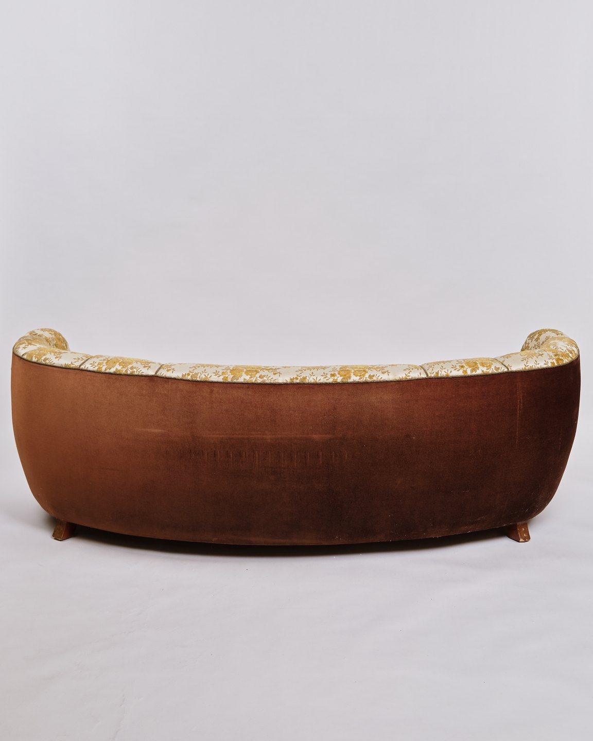 Dansk banan sofa fra 1930-40’erne. Blomstret betræk og ben i eg. H: 67 cm, B: 200 cm, D: 69 cm, SH: 36 cm. Klassisk dansk møbelhåndværk