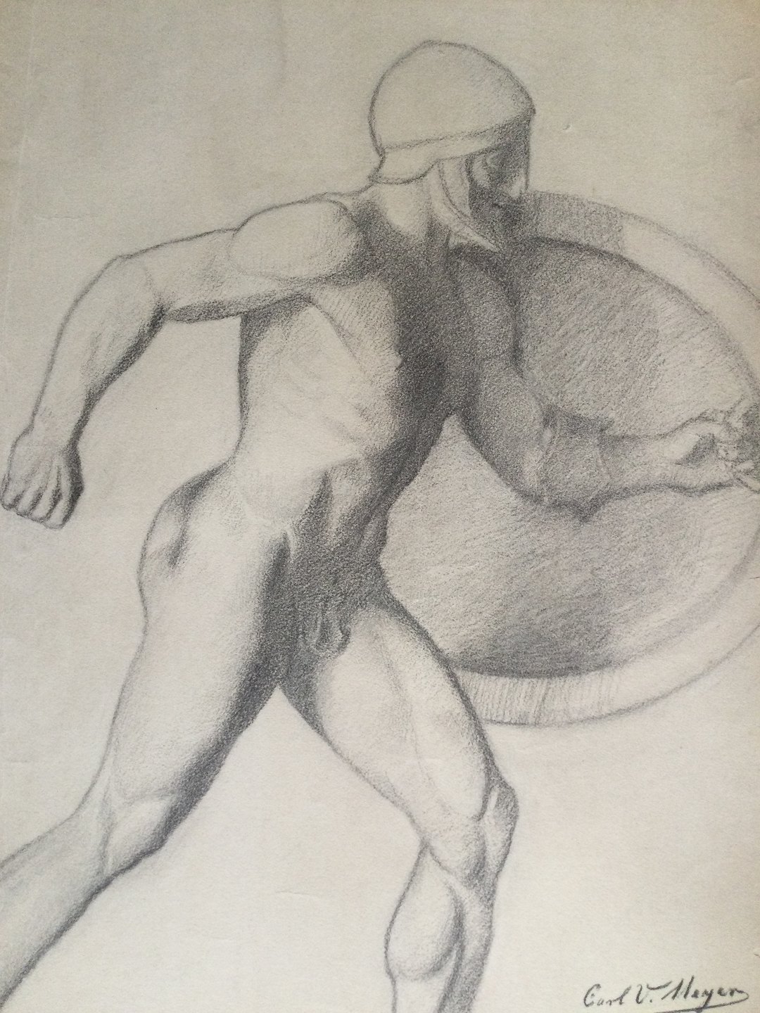 Akademitegning af Carl V. Meyer - Nøgen kriger med skjold 1893.