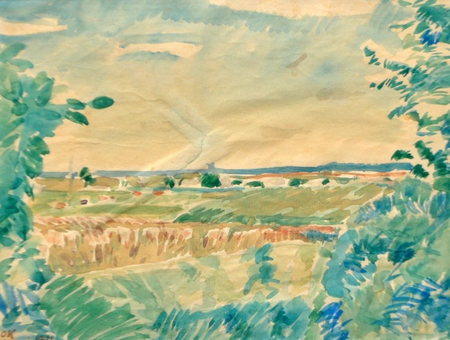 Kielberg, Ole (1911 - 1985) Danmark: Mark landskab, 1941. Akvarel på papir. Signeret: OK 19 juni 1941. H: 20,5 cm. B: 26,5 cm.