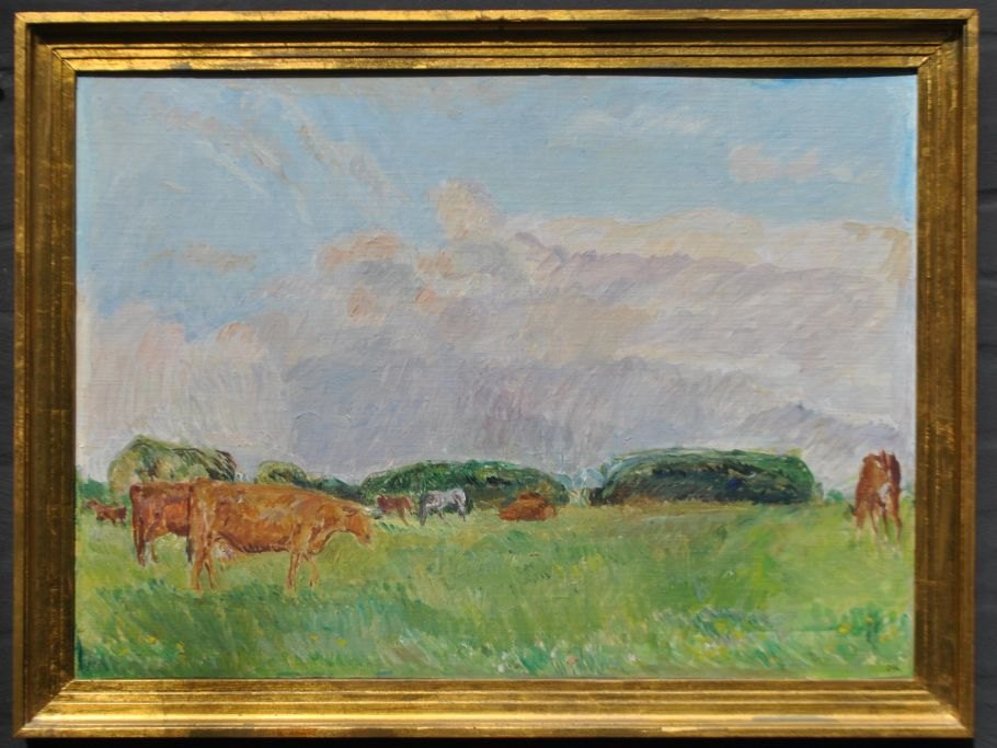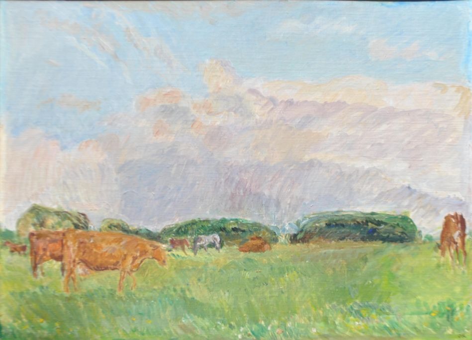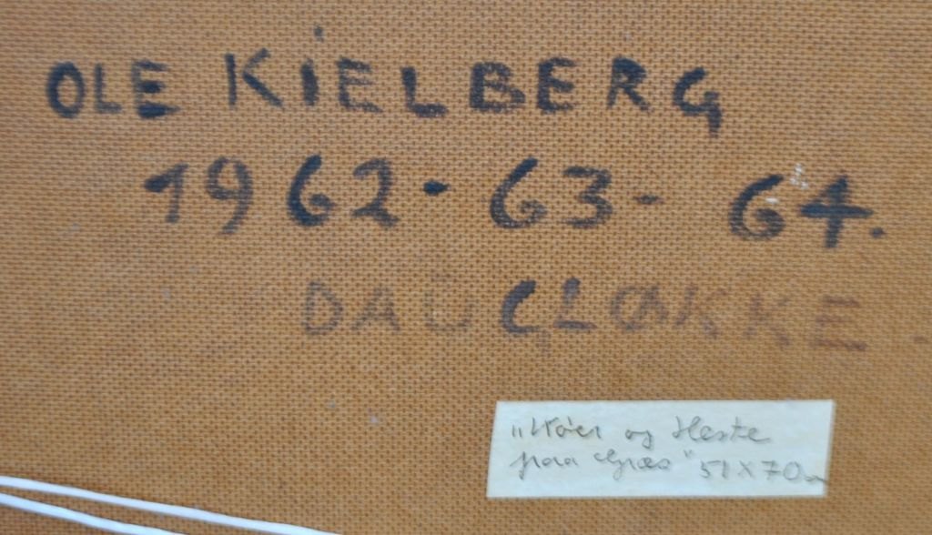 Kielberg, Ole (1911 - 1985) Danmark: Køer og heste på græs, 1962-64. Olie på lærred. Signeret: OK og bagpå: Ole Kielberg 1962-63-64 Daugløkke. H: 51 cm. B: 70 cm.