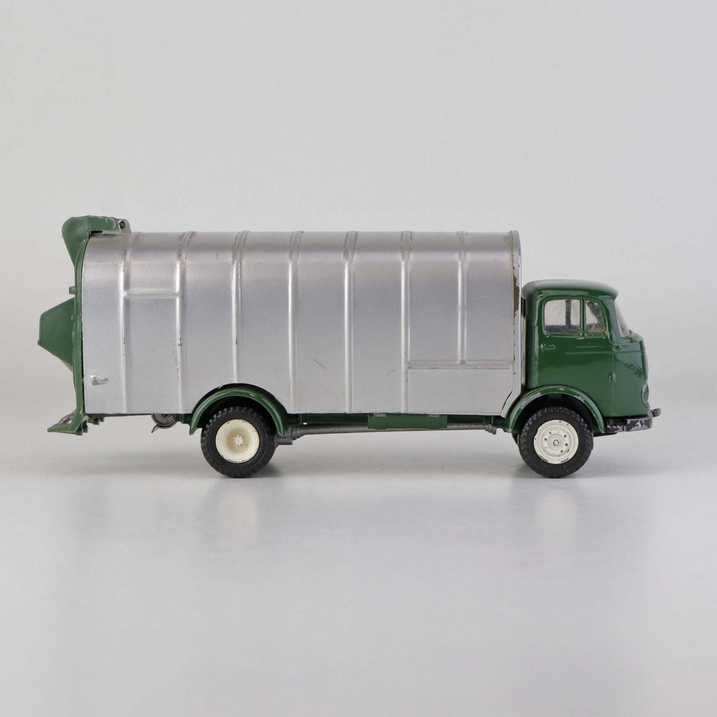 Legetøjsbil. Affaldsbil med sækkevogn i lakeret metal med gummi hjul.