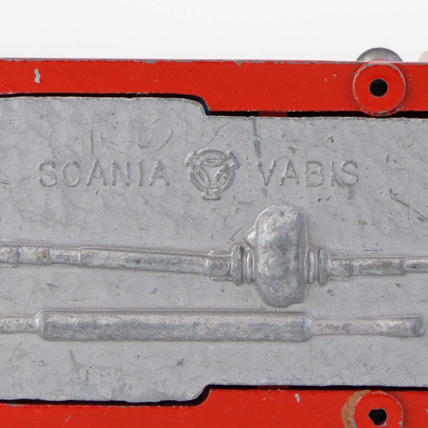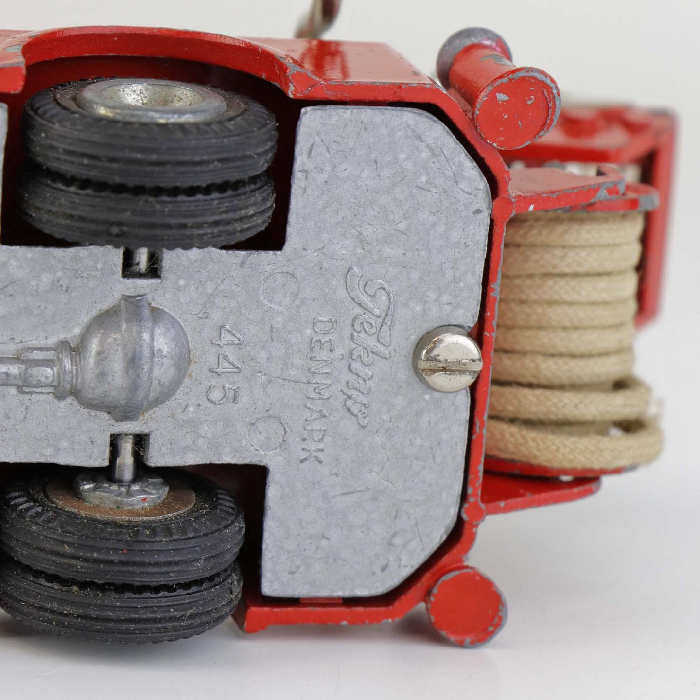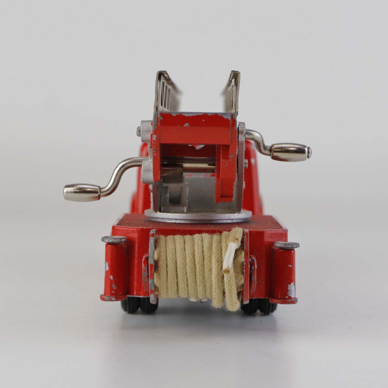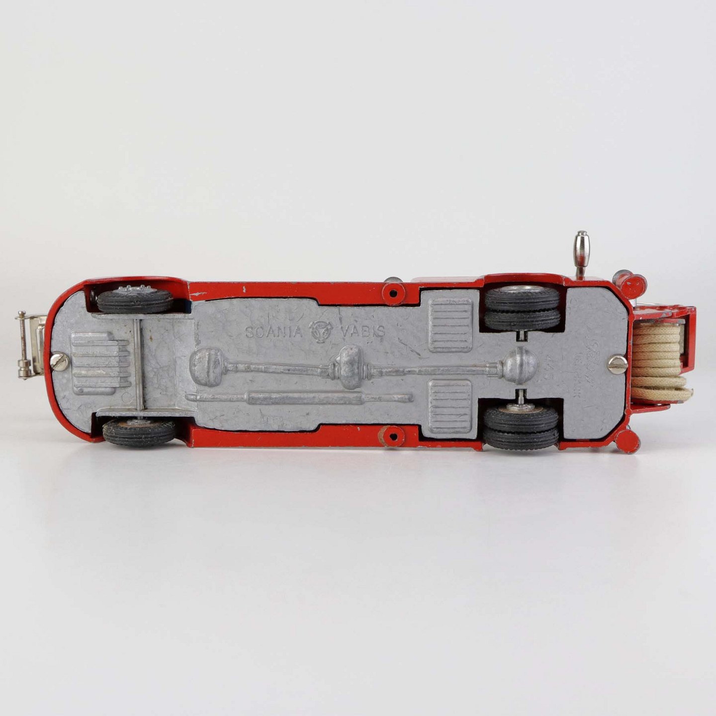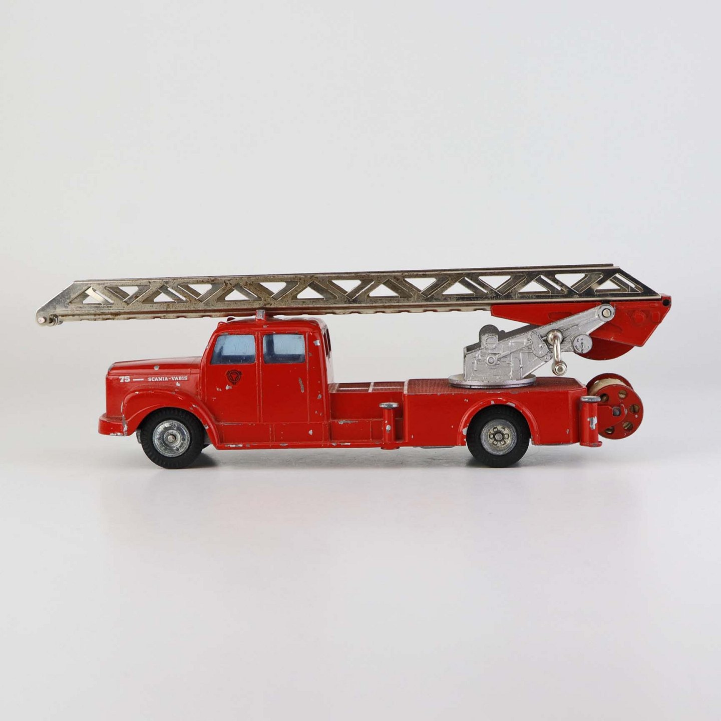 Legetøjsbil. Scania vabis brandbil stigevogn i rødlakeret metal med gummi hjul og drejbar stige med ekstra udtrækstige samt aftagelig oprullet brandslange.
