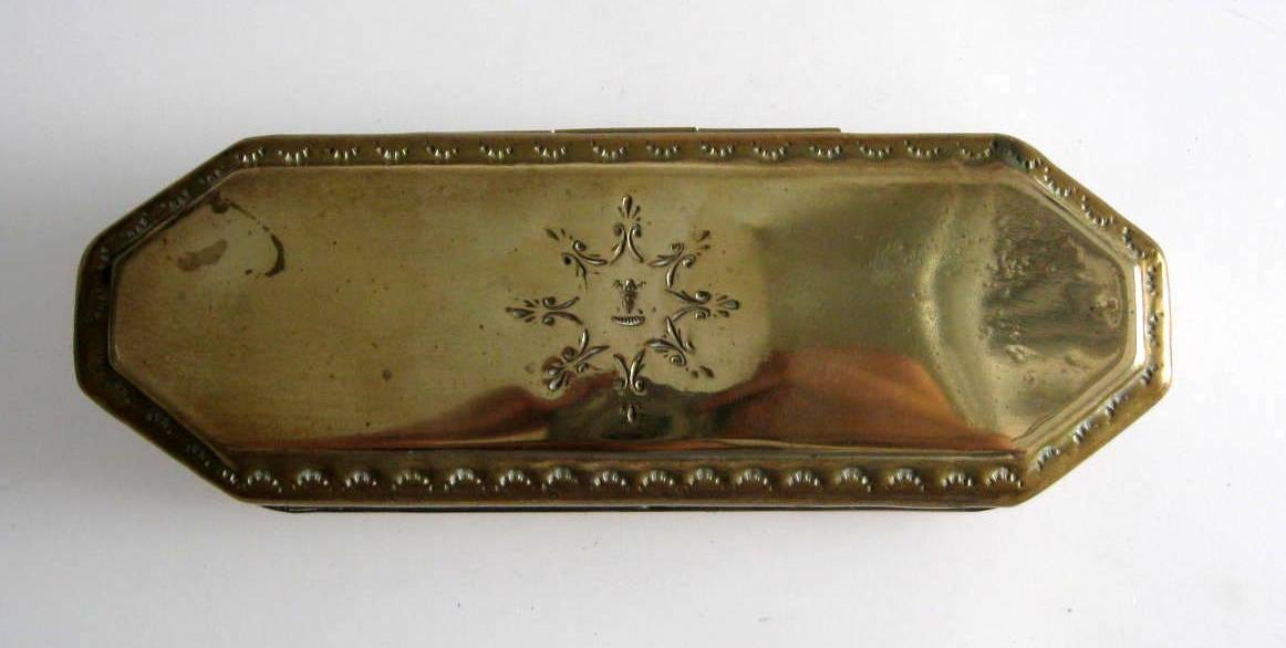 Snustobak dåse i messing, 18. årh. Ottekantet. L.: 15 cm. Dekoreret med fleur de lis og ansigt med krone.