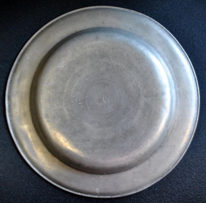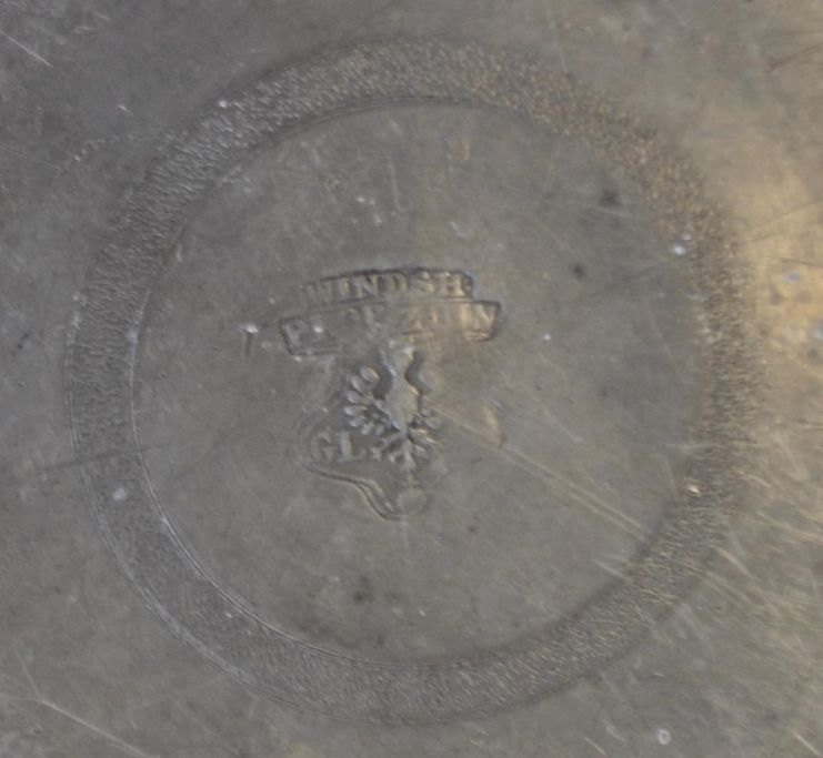 Tin fad, 19. årh. Tyskland. Stemplet: Windsh. På fanen indgravering med navn: G. Frann.... Dia.: 29 cm.