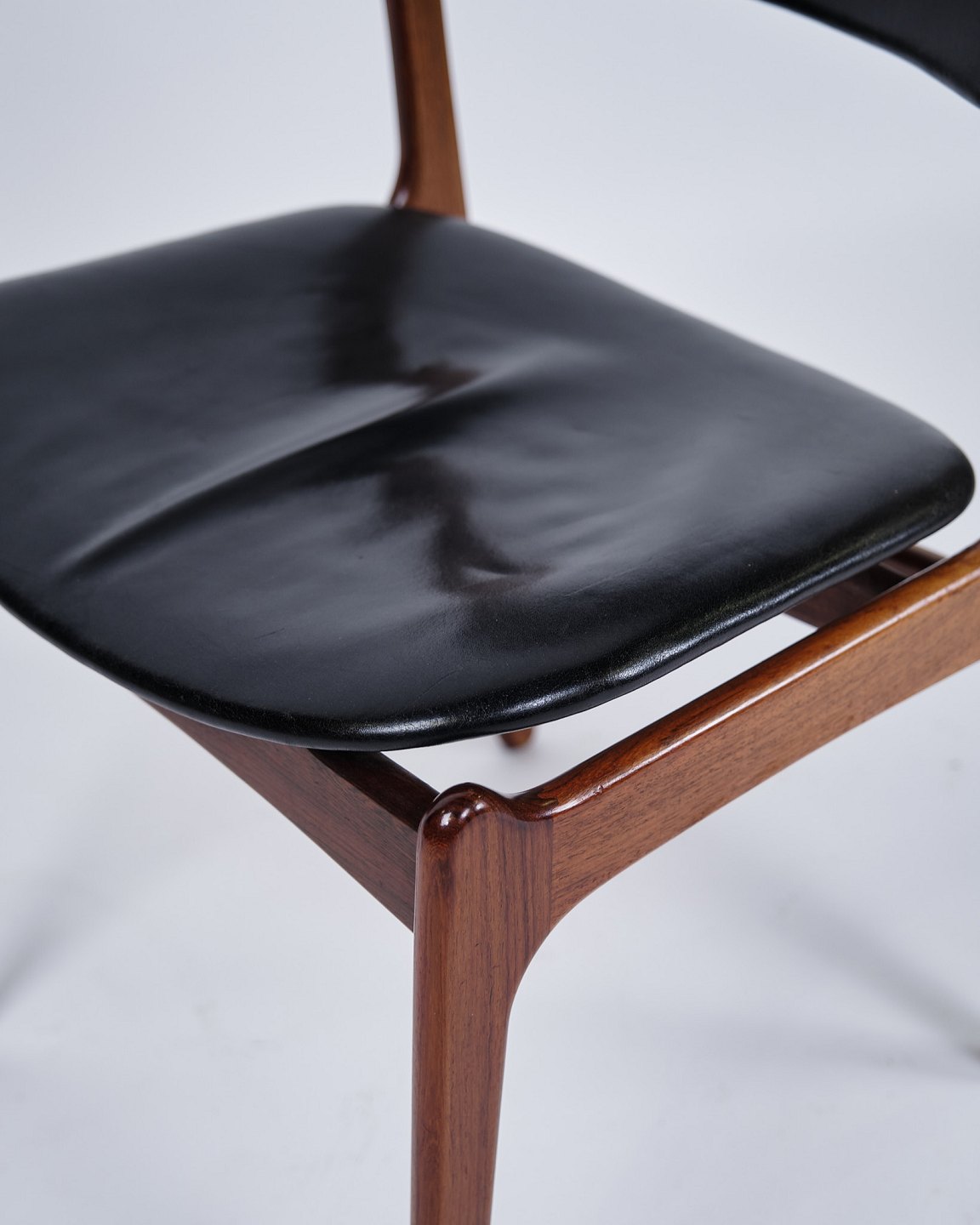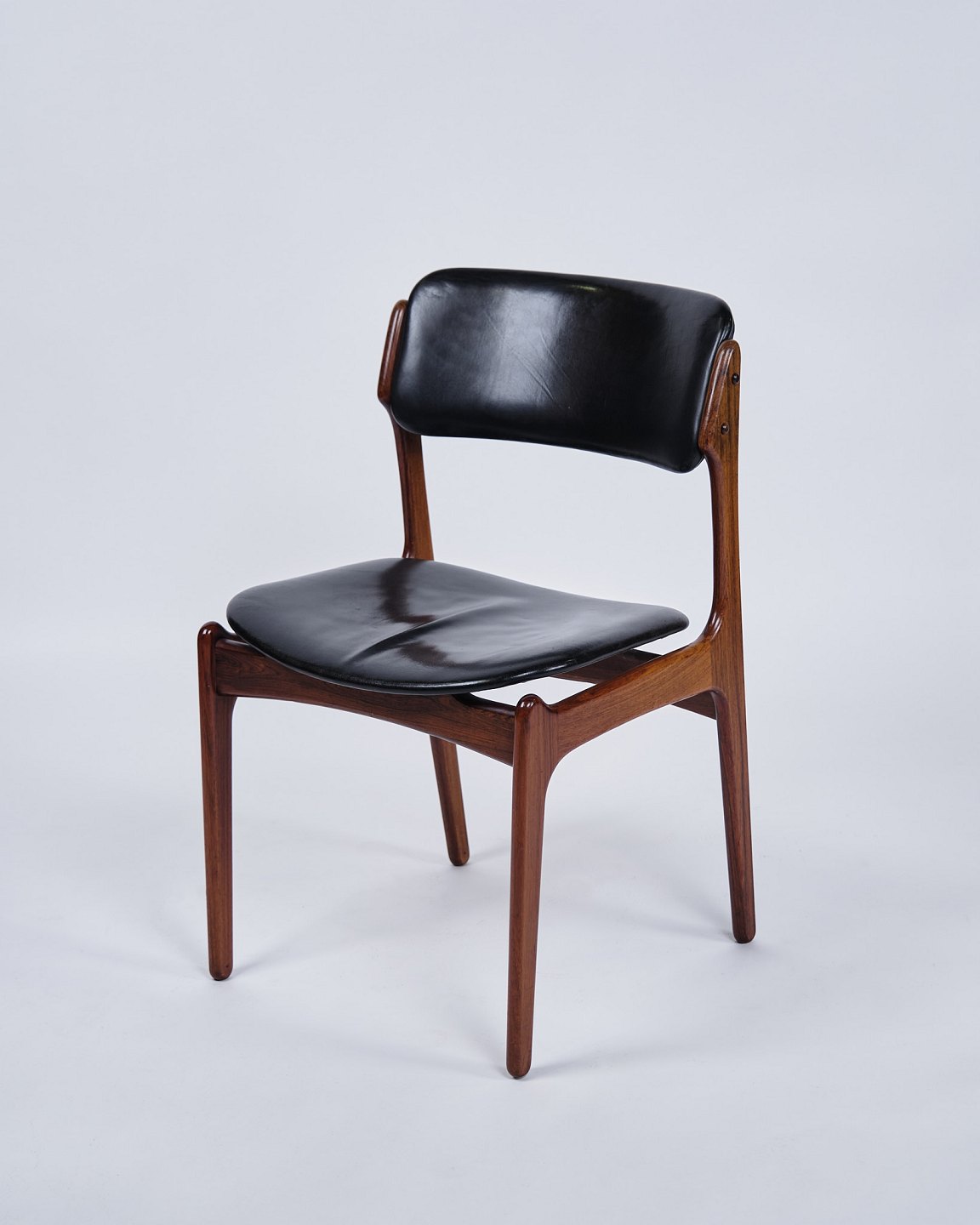 Sæt af seks Erik Buch spisebordsstole, model OD49. Palisander med sort læder. O.D. Møbler, 1950’erne.