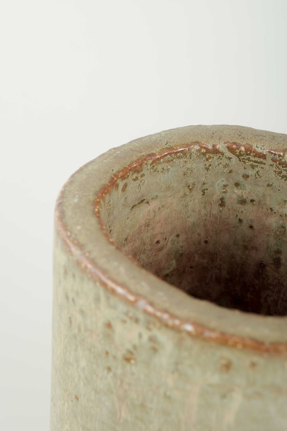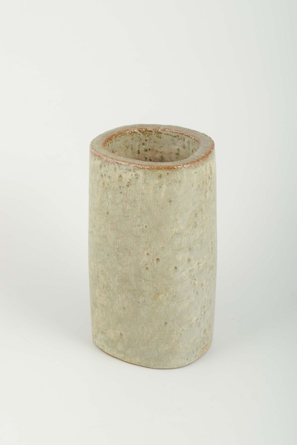 Cylindrisk vase i drejet stentøj med lys, grønlig glasur med nuanceret spil og let rustik overflade.