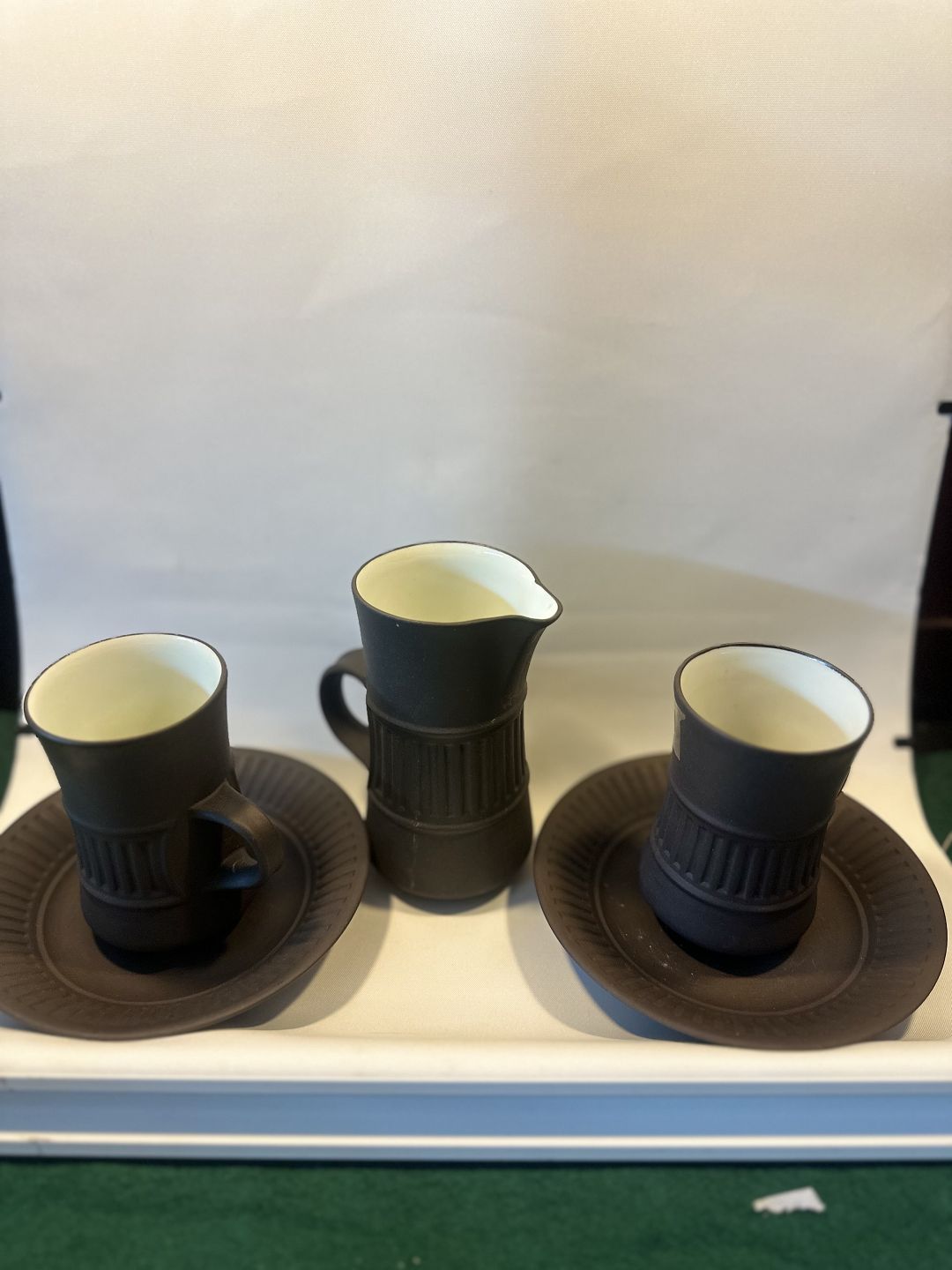 Steingut-Teeservice von Jens Harald Quistgaard aus den 50er Jahren. 4 Teetassen mit Untertassen, 1 Milchkännchen, schöner und ordentlicher Zustand