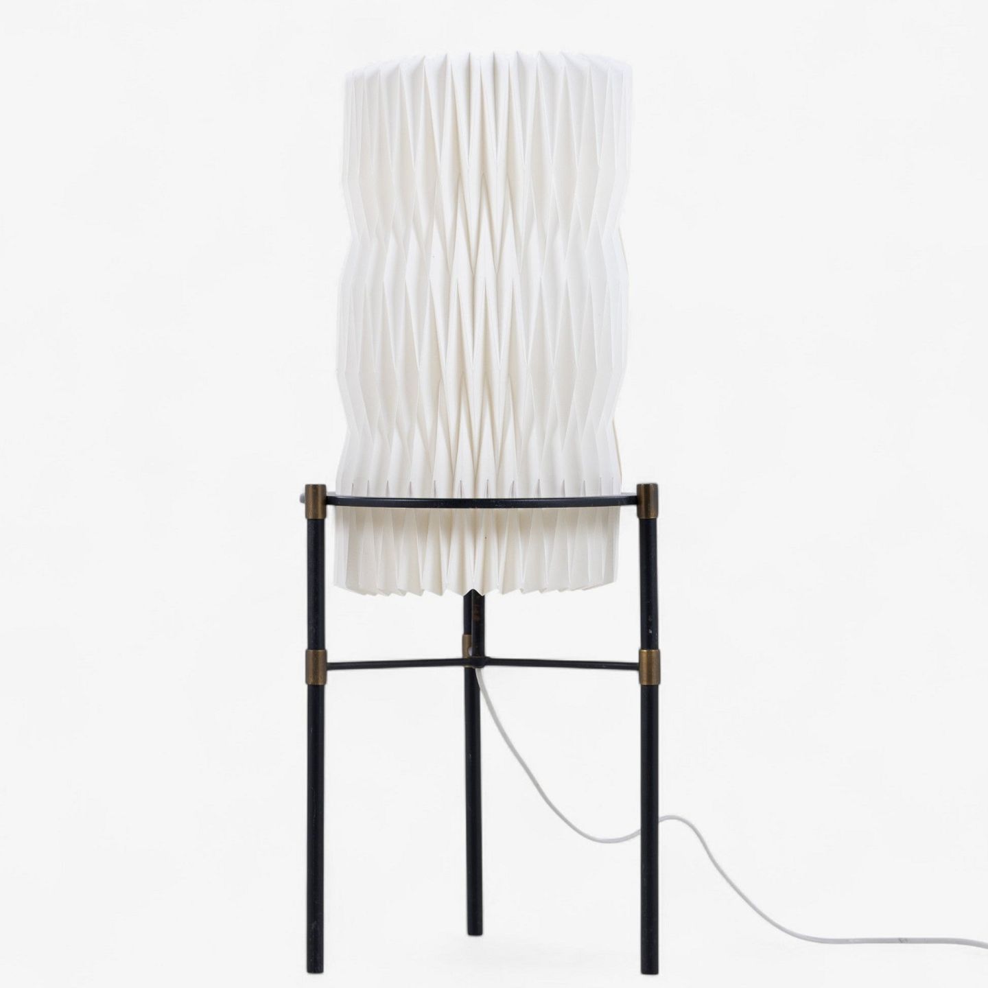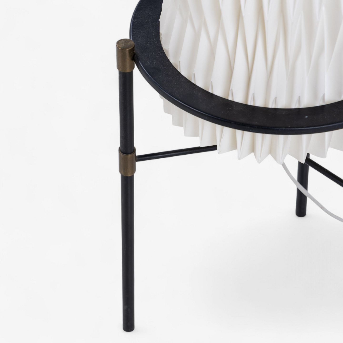 Par bordlamper på trepas fod i sortlakeret metal med hvide plisserede skærme.
