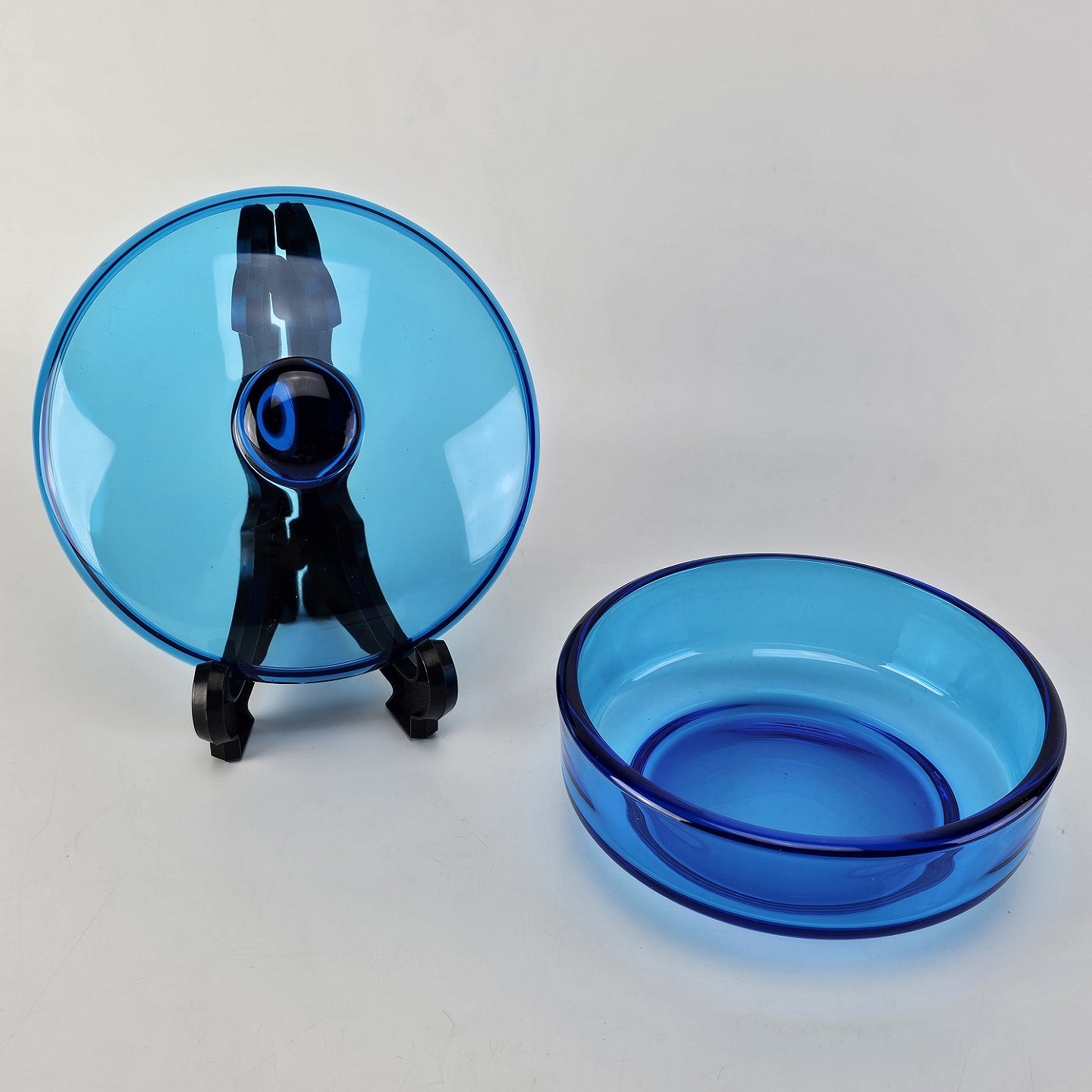 Skål i klart blåt glas med låg