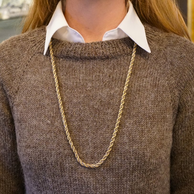 Snoet halskæde af 14 kt. guld og hvidguld, i ekstra lang kvalitet.