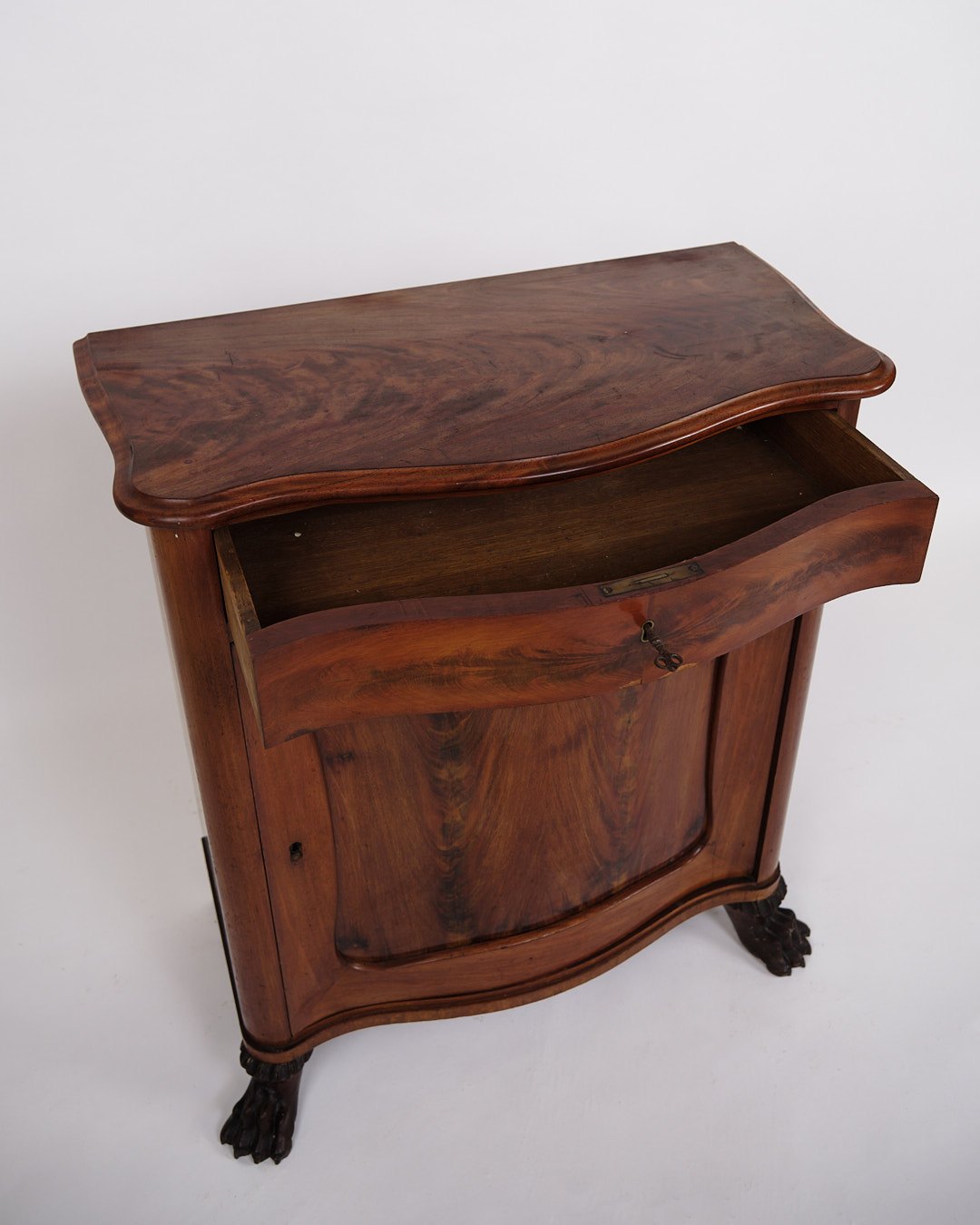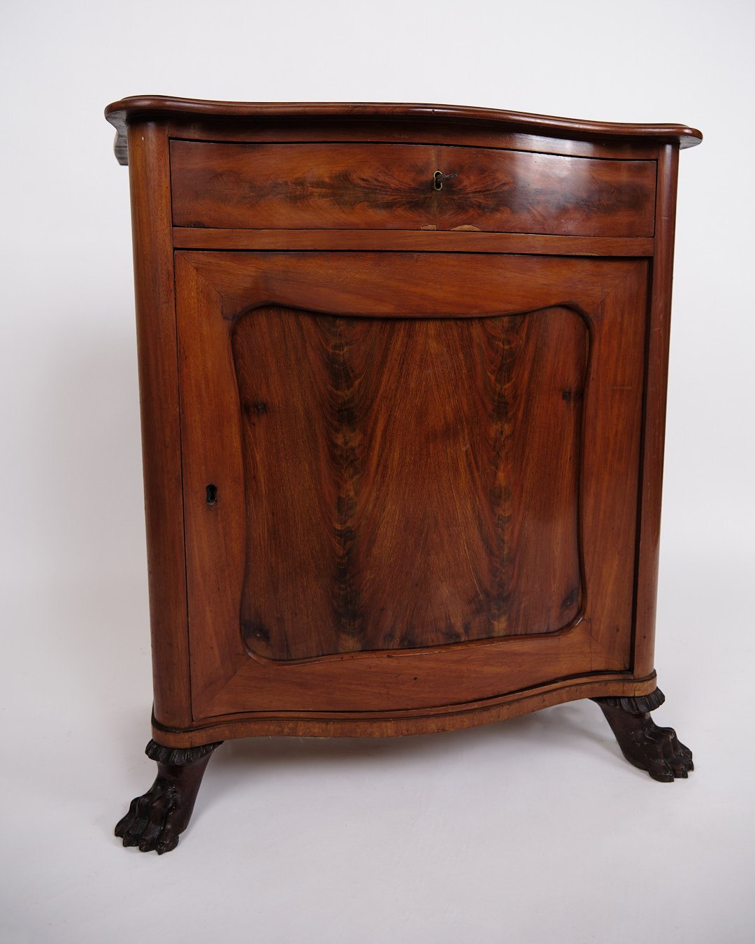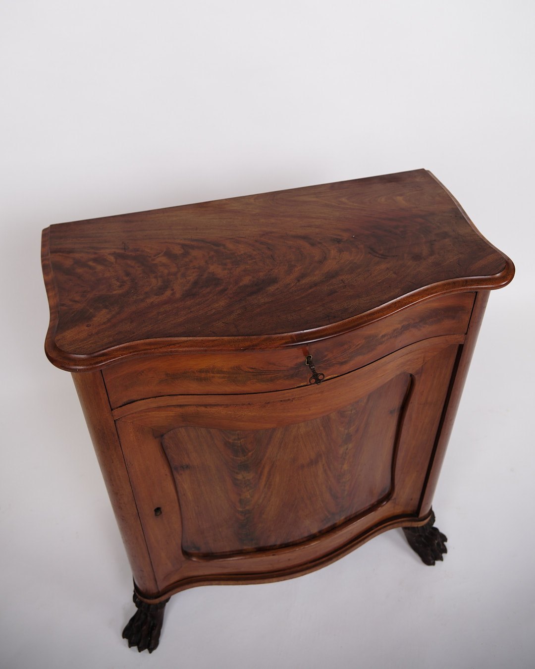 Lille konsol-/entrémøbel fra 1890’erne, udført i håndpoleret mahogni med flamme struktur. Skabet står på detaljerede løvefødder, der giver et elegant og klassisk udtryk.