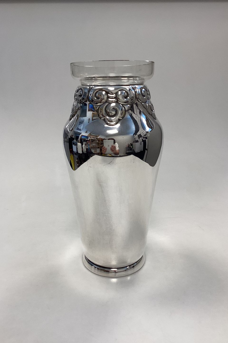 Art Nouveau / Deco Sølvplet Vase med glasindsats. Dansk produceret mærket Eneret Astral. Tydelige slidmærker på den ene side, se fotos.