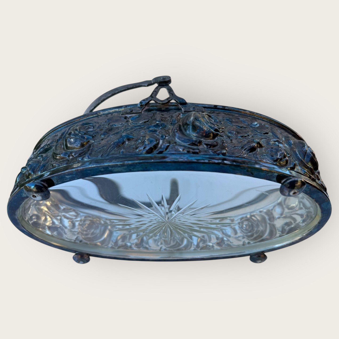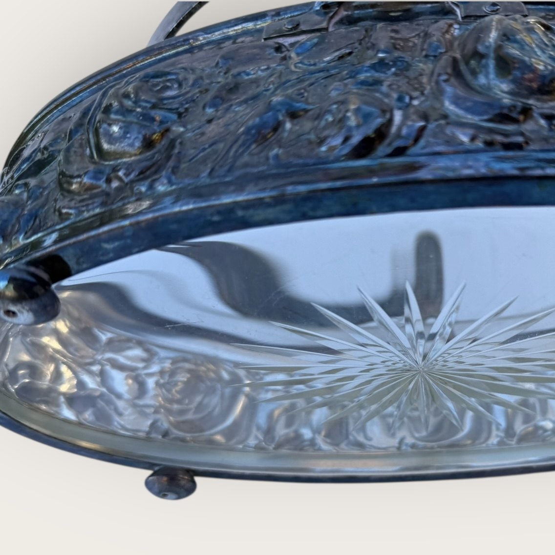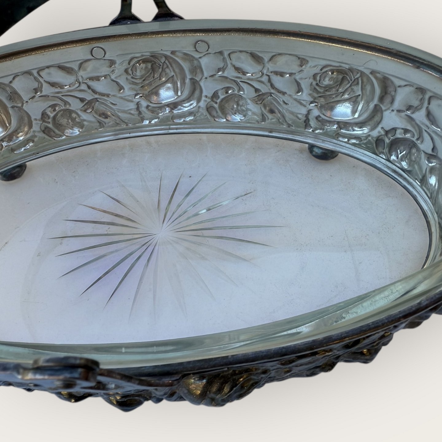 Skål med glasindsats i sølvplet med udsmykning af roser og med hank, 25x14cm. *Flot patineret stand, med hel glasskål*