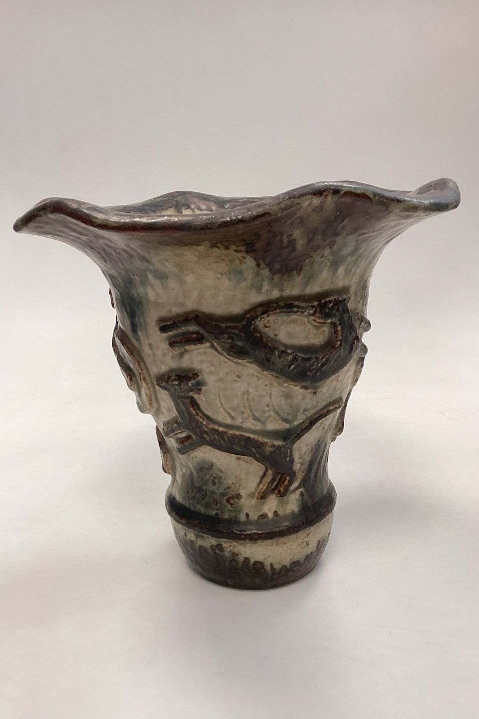 Vase med bølget kant. Motiv af kriger med sværd og skjold, i kamp med vilde dyr. Er i meget fin stand.